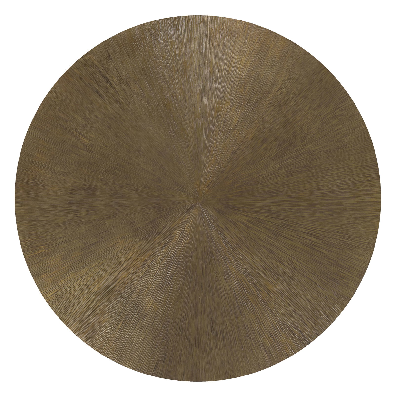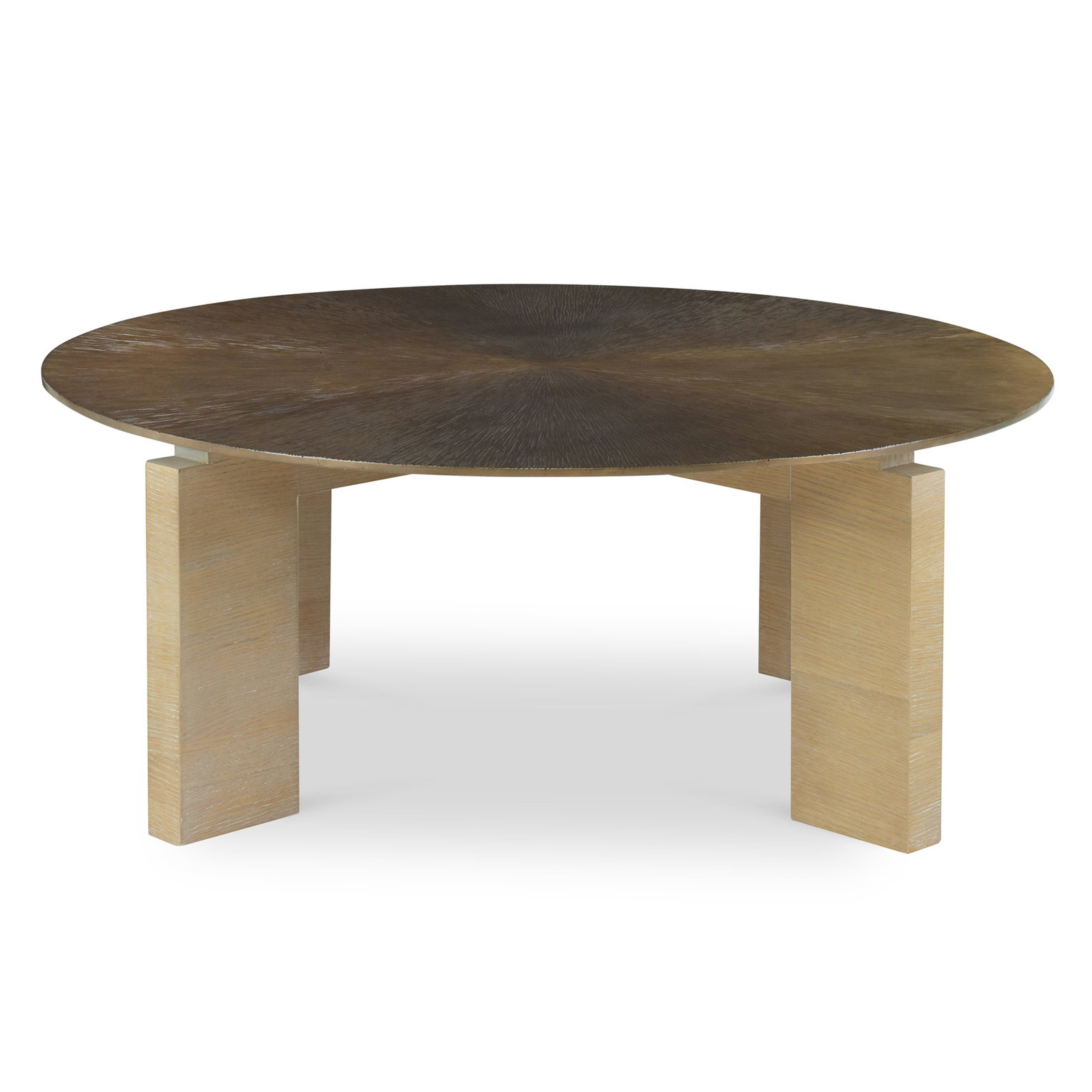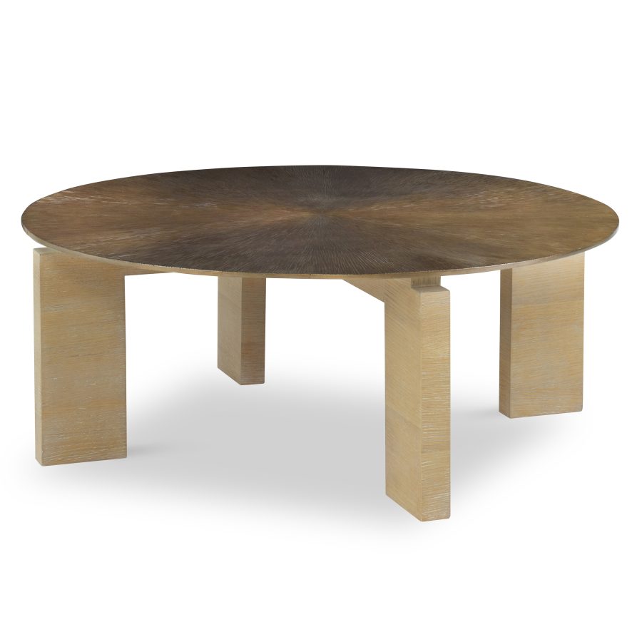 Product Description: Ambella Home 65035-920-001 Compass Cocktail Table - Four cerused, Oak legs support an etched metal top on the round cocktail table designed by Erinn V.
