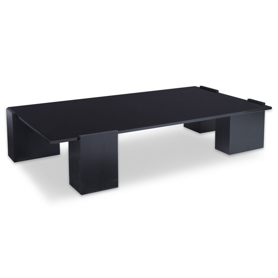 Product Description: Ambella Home 71001-920-001 Quad Cocktail Table - This large cocktail table features a black glass top raised over ebonized White Oak block legs. A hidden metal frame ties the legs together under the glass top. Designed by Erinn V.