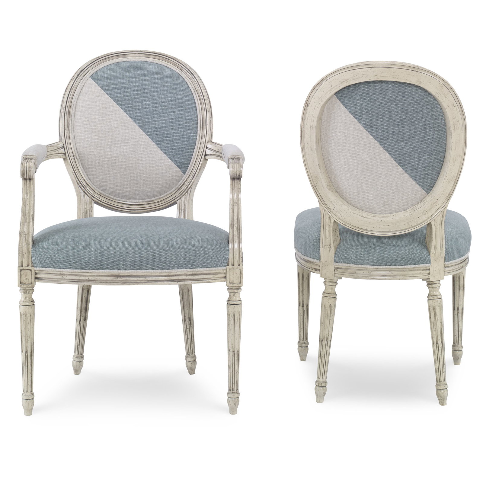 Product Description: Ambella Home 851-00 Dauphin Dining Room Arm Chair - In interiors, the quintessential French chair is the oval back dining chair. Pictured in drawings, paintings, described in textbooks and fiction alike, this was the “it” chair of the 1700’s. Our version, available with or without arms, has a tight seat and upholstered back carved in detail from Beech. It is not only a dining chair, but can be included in living rooms as occasional chairs or as a desk chair when needed. Fluted legs support a carved seat rain and oval back.