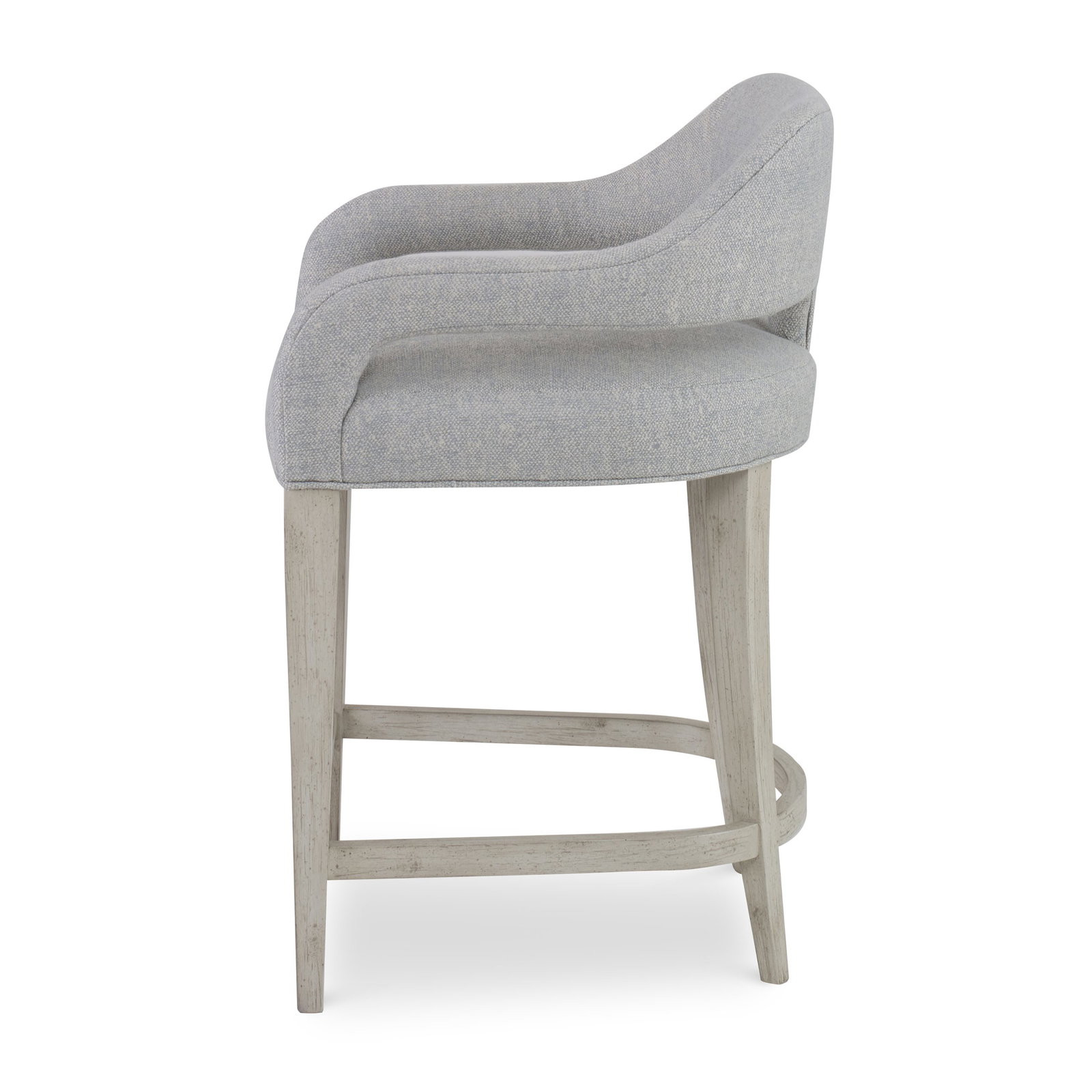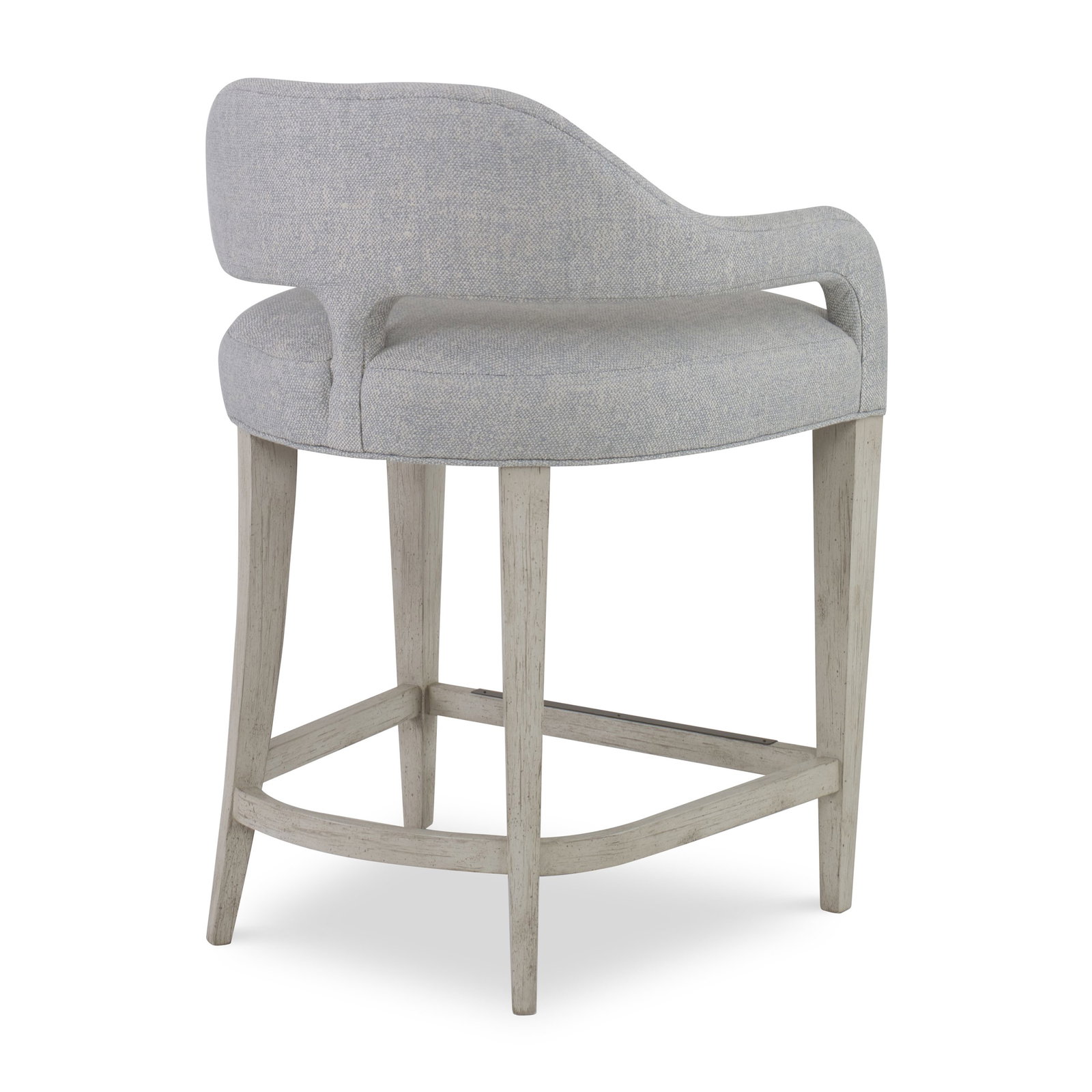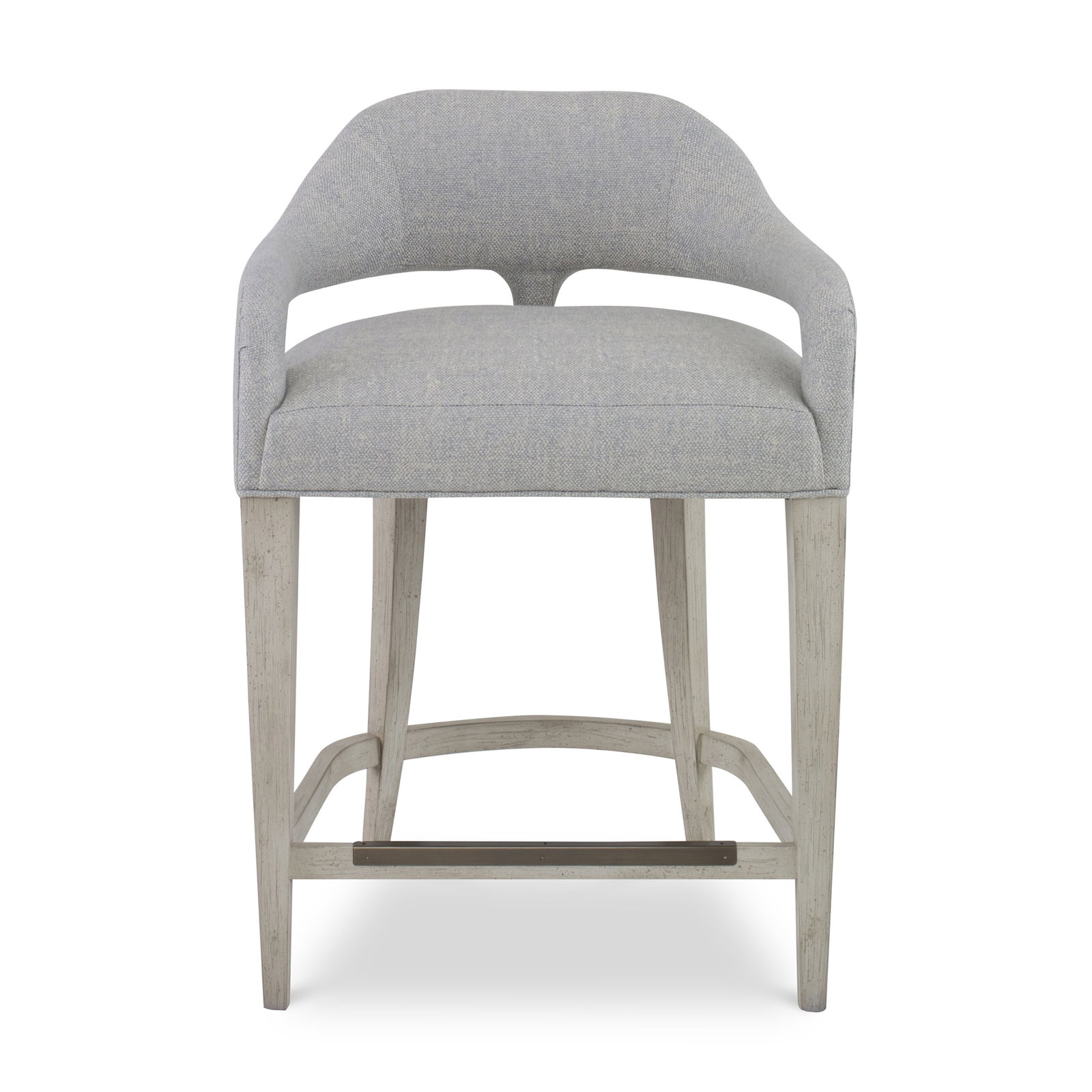 Product Description: Ambella Home 855-00 Croix Counter Stool - These unique stools include an arched back which flows into upholstered arms, raised above a tight seat and tapering Maple legs. A metal foot rest is available in either antique brass or polished nickel.