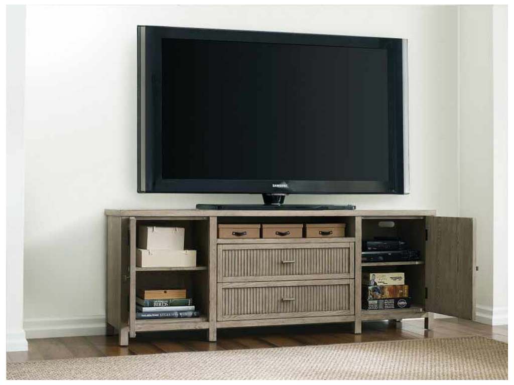 Product Description: American Drew 924-585 West Fork Merit Media Cabinet - Merit Media Cabinet is beautifully designed with textured drawer and door fronts. Two drawers and center open compartment for media storage. Two doors with one adjustable shelf behind each, adjustable levelers, cord exits and electrical outlet behind left side door.