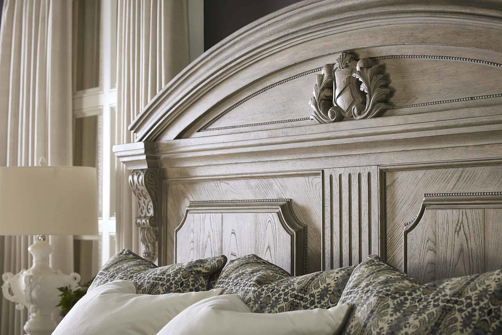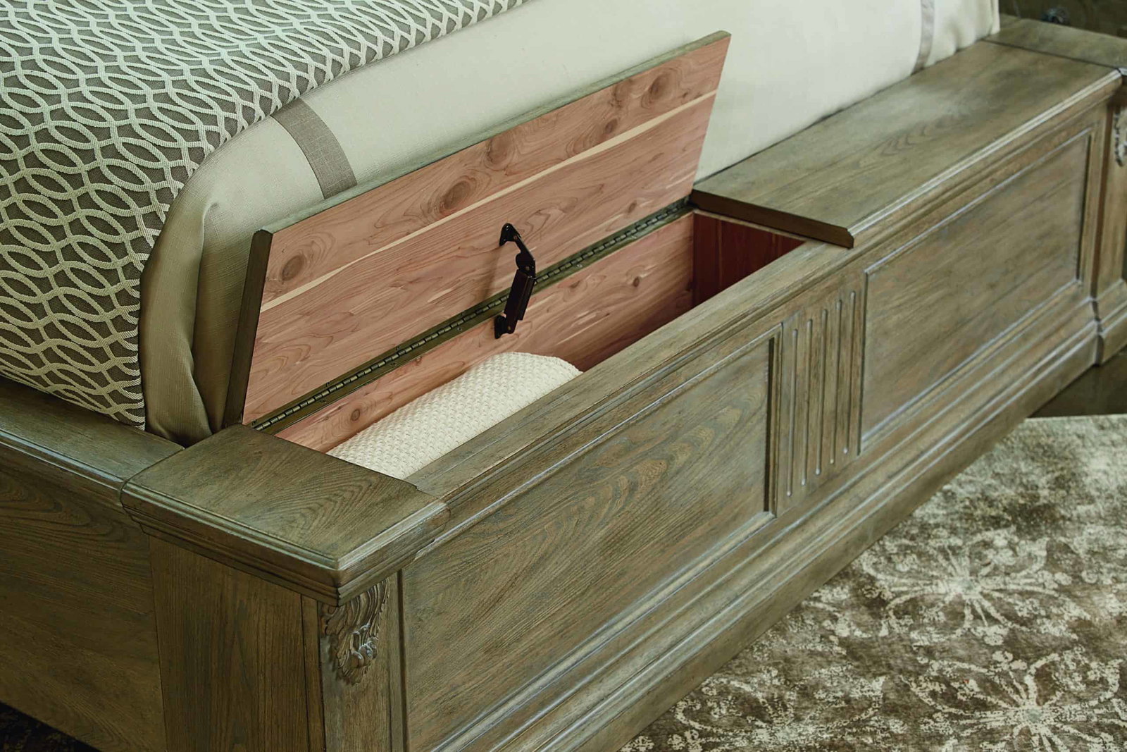 Product Description: ART Furniture 233155-2802 Arch Salvage Queen Chambers Panel Bed - The generously scaled Chambers Bed, constructed of Parawood solids and cathedral elm veneers, has a curved pediment, deep molding, a carved heraldic shield cartouche, and carved corbels and acanthus leaf motifs. The broad footboard opens to reveal a cedar-lined storage chest. The bed comes in Parch, a light open-grained finish and is available in Queen, King and California King sizes.