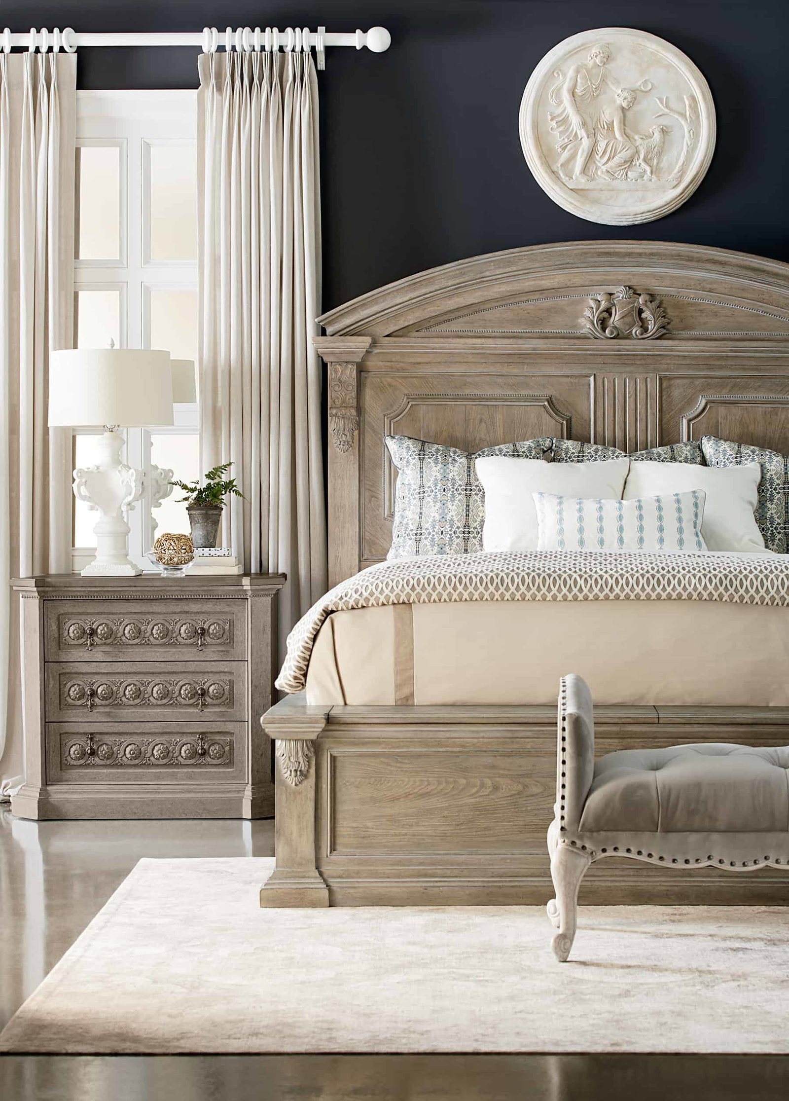 Freely borrowing from the classical architecture of Europe’s most beautiful cities, Arch. Salvage reinvents traditional style with confidence and sophistication. The collection is rich in repurposed details: carved corbels on a dresser inspired by a neoclassical marble mantel, a cedar-lined storage compartment hidden in the footboard of an imposing bed, carved scrollwork recalling the beauty of a cast iron railing. The architectural theme is reinforced with a soft earthy palette and gently weathered finishes.