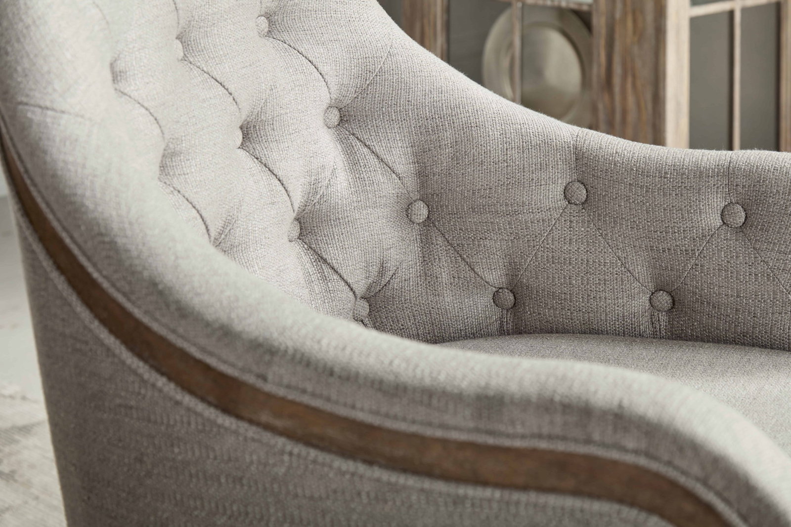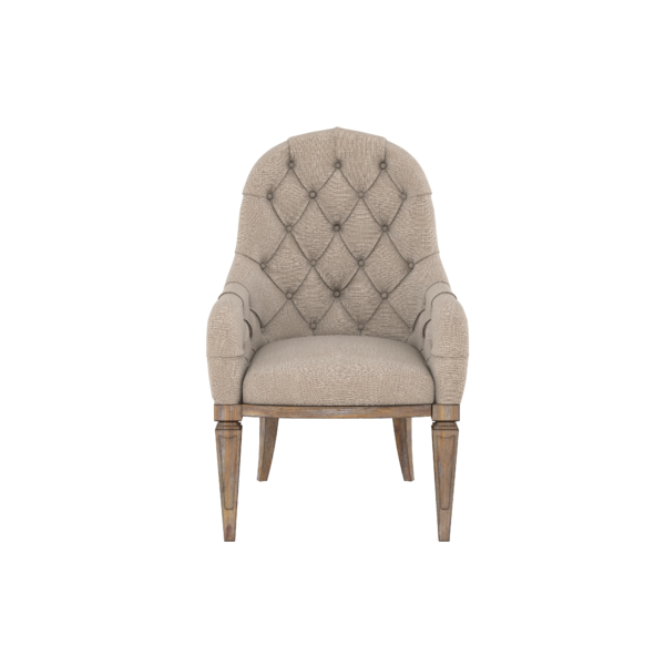 Product Description: ART Furniture 277207-2608 Architrave Upholstered Arm Chair - This dining chair from the Architrave collection is inspired by antique French neoclassical design, from its gracefully curved back to the elegantly tapered legs. Crafted from pine in a rustic hand-glazed finish, the chair is upholstered in a soft neutral woven fabric, complete with luxurious button tufting for maximum eye-catching comfort. This arm chair can be used to enhance a dining chair set or as an occasional chair in a bedroom or living space.