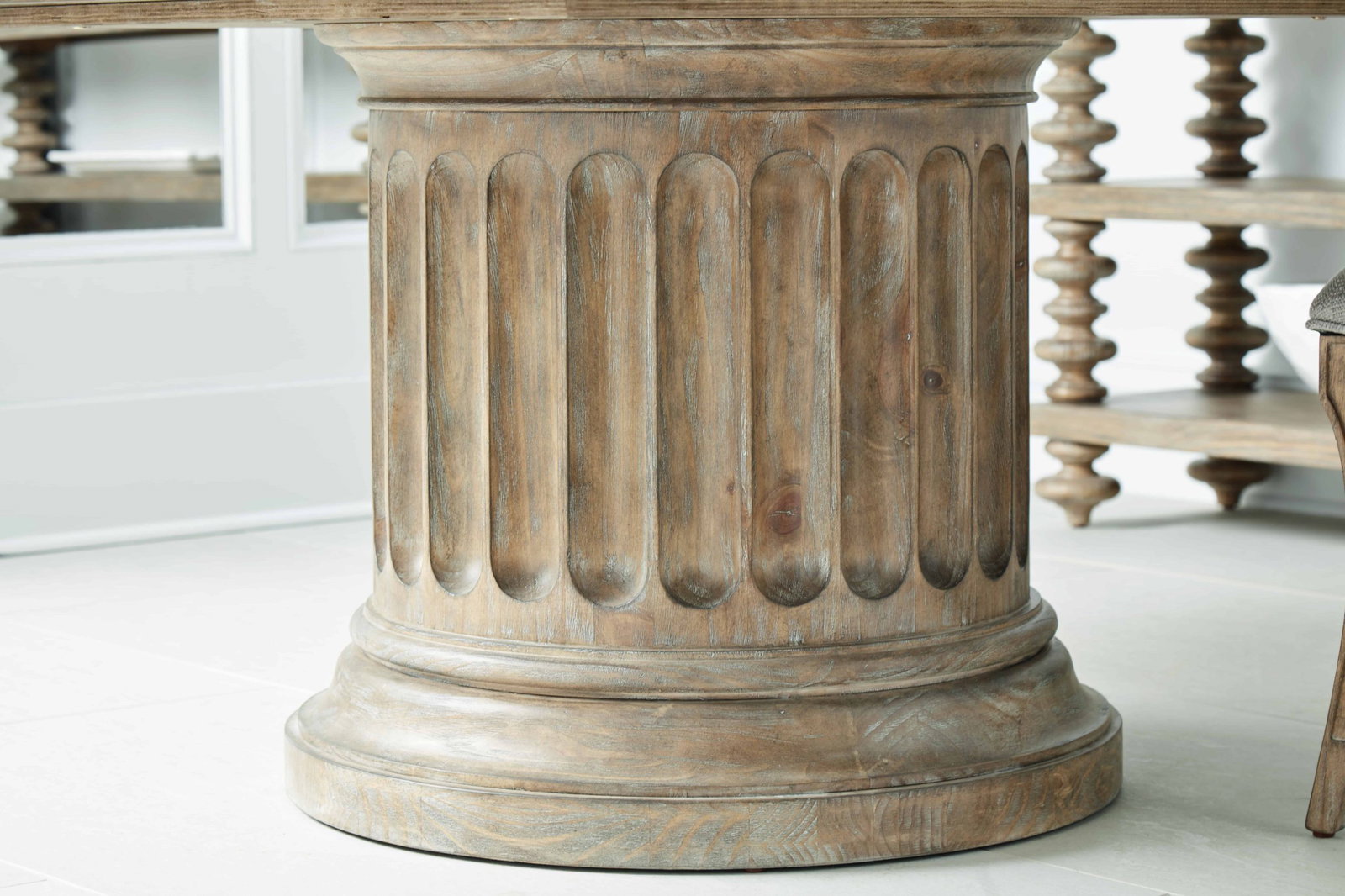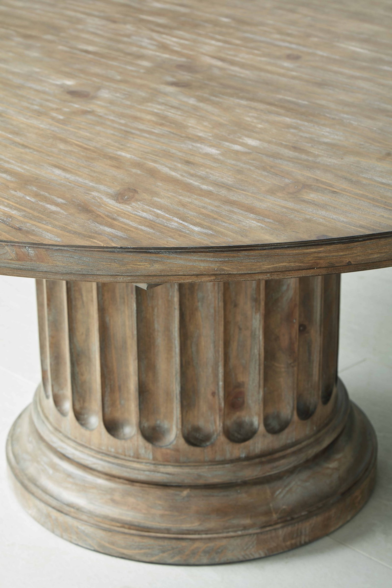 Product Description: ART Furniture 277225-2608 Architrave Round Dining Table - Strikingly fashioned with a massive fluted column at its center, this classically-inspired dining table has earned its place in the temple of style. This bold design highlights the architectural beauty of Roman-style columns, as well as the loveliness of natural wood grain. The table is topped by a simple round of rustic pine in a warm, hand-glazed finish, balancing Old World formality with laidback modern charm.