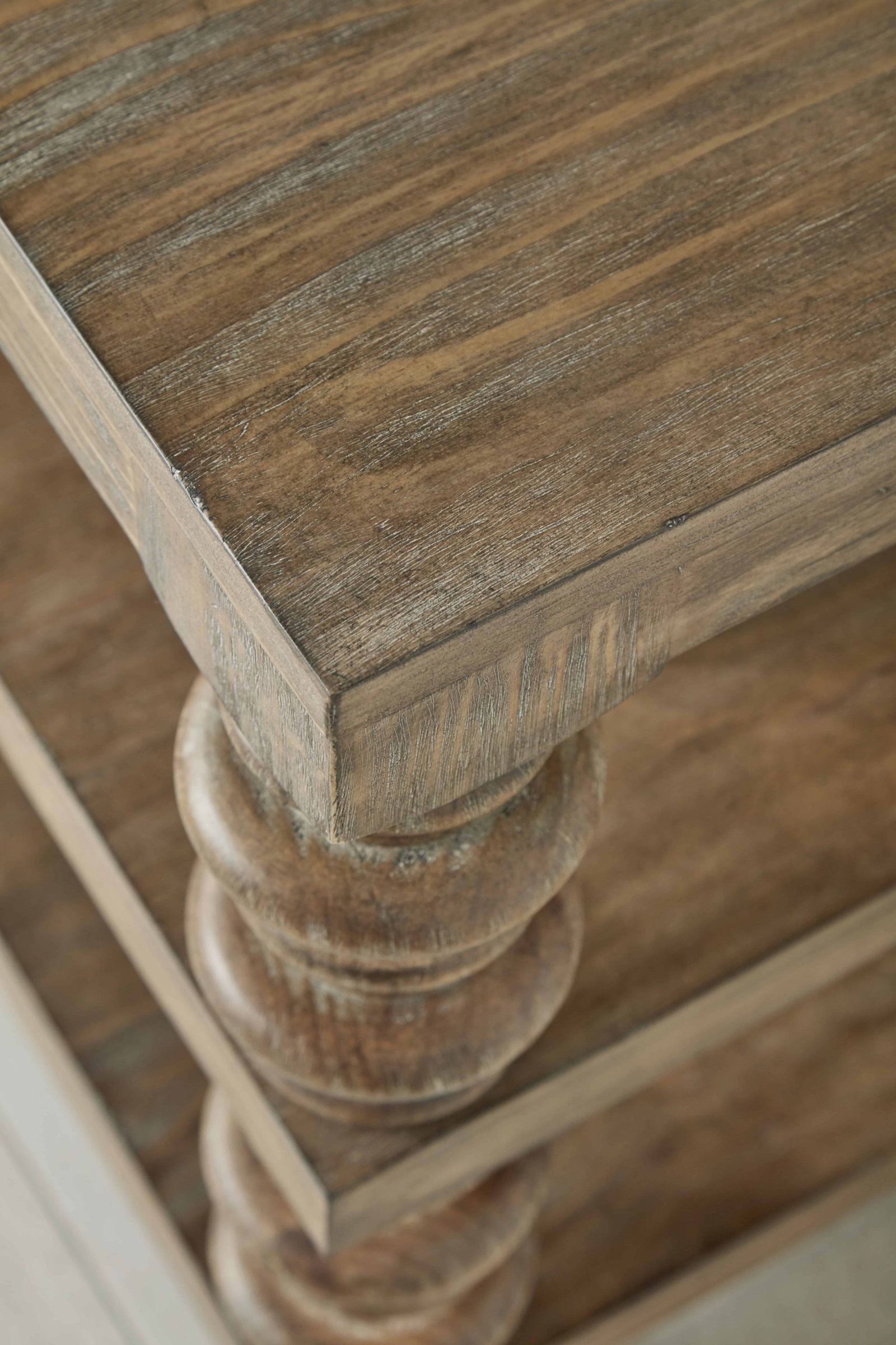 Product Description: ART Furniture 277303-2608 Architrave End Table - Gracefully turned wood columns support the top of the Architrave End Table, as well as two open shelves for storage or display. The finish on the wire-brushed pine construction is a rustic hand-glazed almond tone, which adds casual traditional-meets-modern flair to any living space.