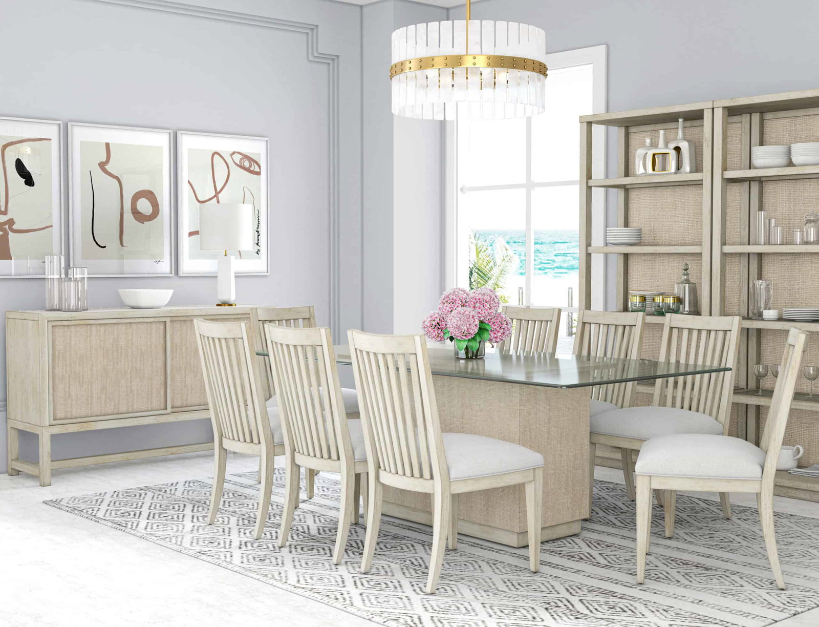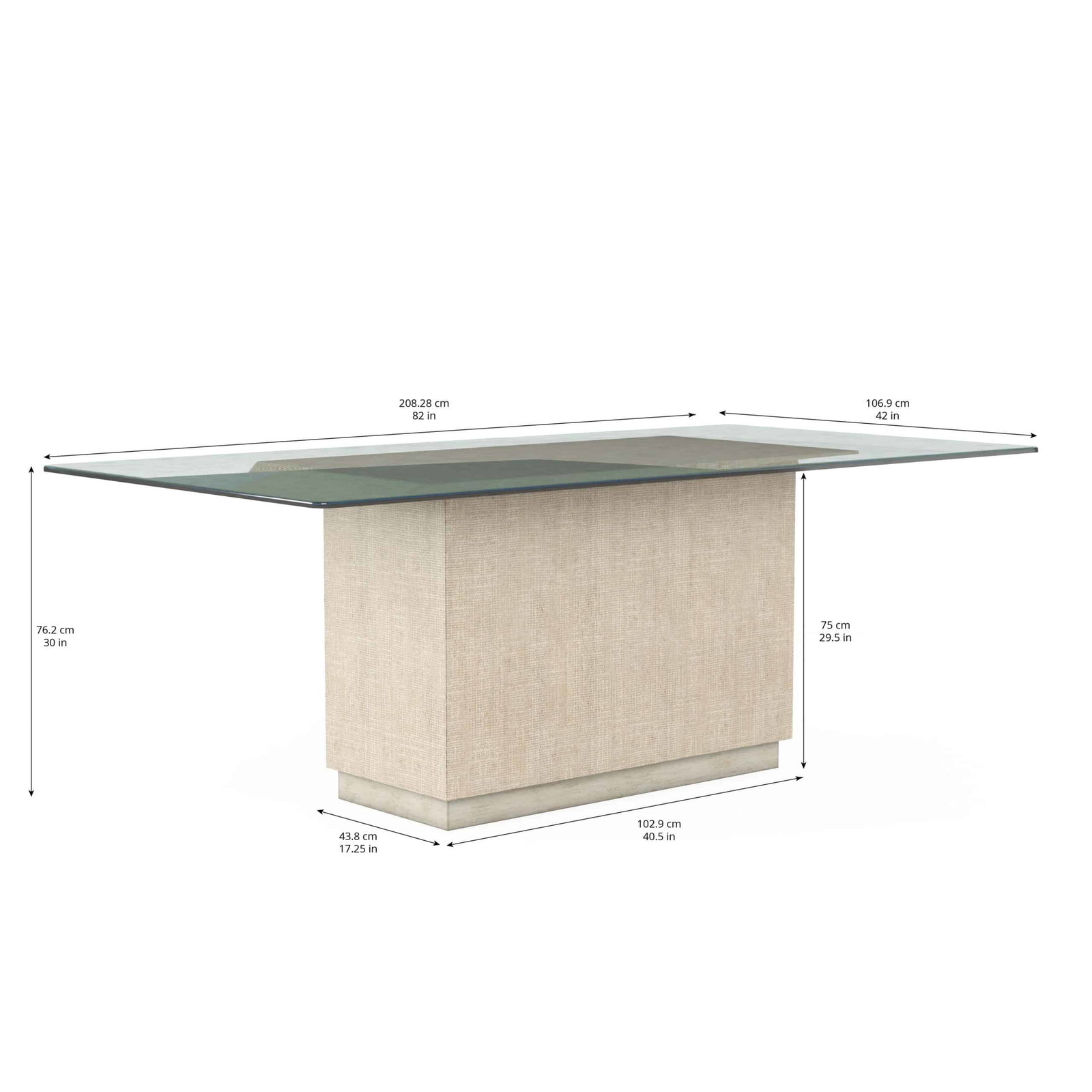 Product Description: ART Furniture 299221-2349 Cotiere Rectangular Dining Table - Make your dining room the center of attention with this boldly constructed table. A rectangular central column crafted from parawood solids wrapped in woven fabric rises from the floor like modern architecture, supporting an 82-in glass top finished in white oak veneer that’s generously proportioned enough for everything from family meals to dinner party entertaining.