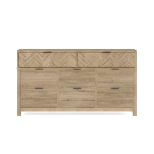 Product Description: ART Furniture 322130-1302 Garrison Dresser - Crafted with precision using quality materials, the Garrison Dresser promises enduring beauty and exceptional longevity. The top portion of the dresser boasts a captivating herringbone pattern, creating a visually stunning focal point that sets it apart from ordinary dressers. Eight drawers are adorned with burnished brass metal tab hardware, adding a sophisticated touch that complements the Washed Oak finish beautifully. Cedar lined bottom drawers complete this stunning case.