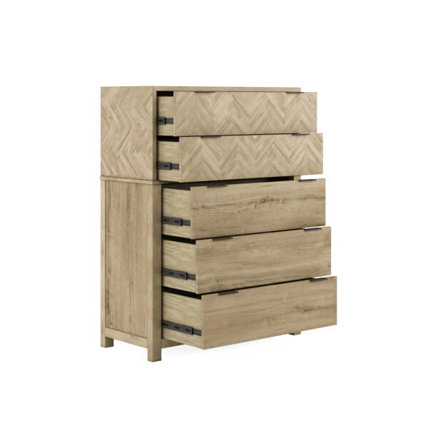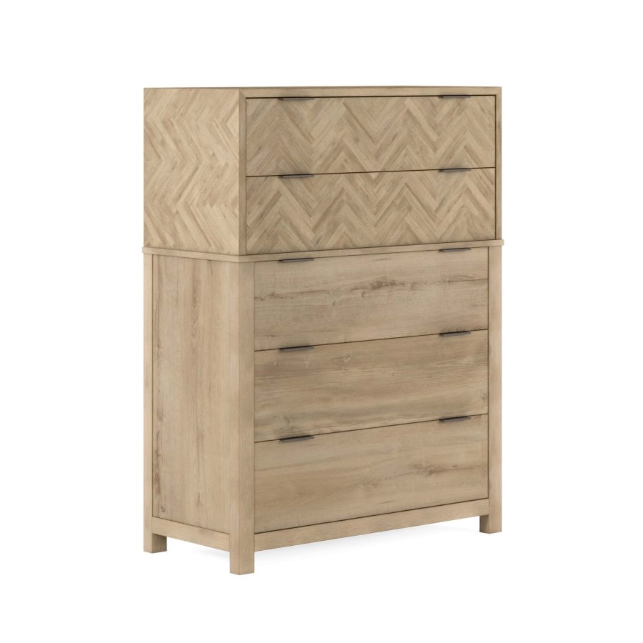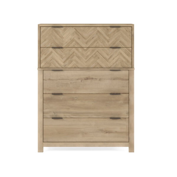 Product Description: ART Furniture 322150-1302 Garrison Drawer Chest - Upgrade your bedroom with the perfect blend of style and functionality using our Garrison Drawer Chest. Its ample storage, luxurious features, and striking herringbone pattern make it an essential piece for any living space. With five spacious drawers featuring side-mount, metal glides, this chest offers ample storage space for your clothing, accessories, and more. The brass hardware elevates the chest’s overall appeal and adds a hint of modern charm.
