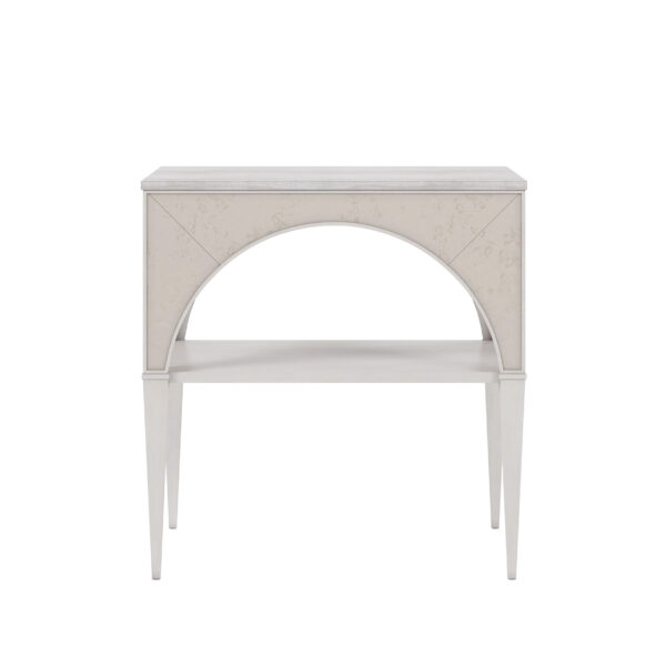 Product Description: ART Furniture 325141-2249 Mezzanine Night Table - This petite night table combines the elegance and grace of the arches of Paris with the glamorous elements of antiqued mirror and a luxurious stone top. A light, open frame finished in dove gray makes this architecturally inspired bedside piece feel airy rather than solid, and a fixed lower shelf offers just enough space for books, baskets, or any other necessities.