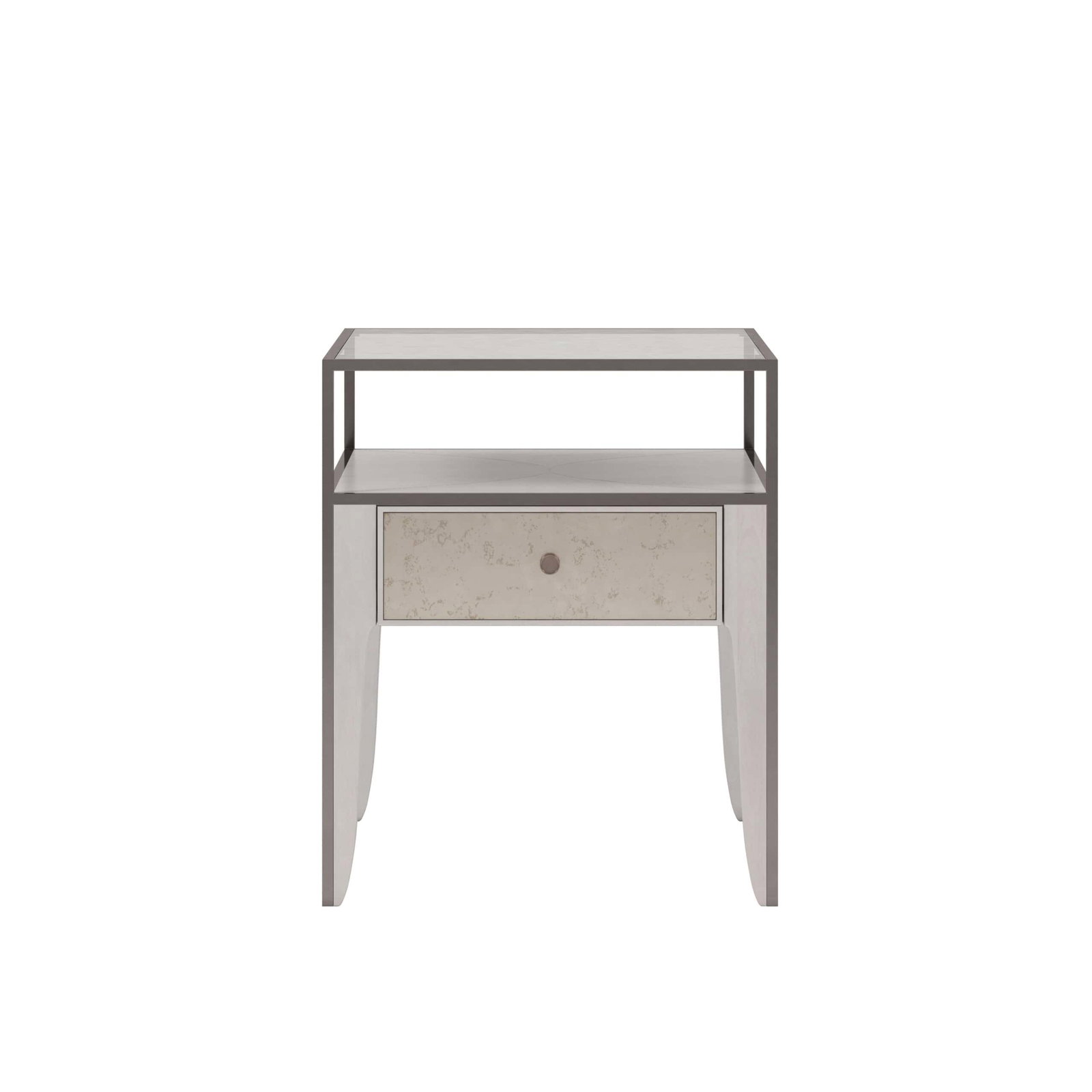 Product Description: ART Furniture 325324-2249 Mezzanine End Table - Simplicity is always in fashion. This versatile end table with a raised glass top is a lovely addition to any room that needs a compact piece offering both storage and style. The natural beauty of maple veneer finished in dove gray contrasts with a sleek metal frame and mirrored drawer front, creating a transitional look that blends vintage warmth with cool modernity. A central drawer allows just enough space for all your living room’s necessities.