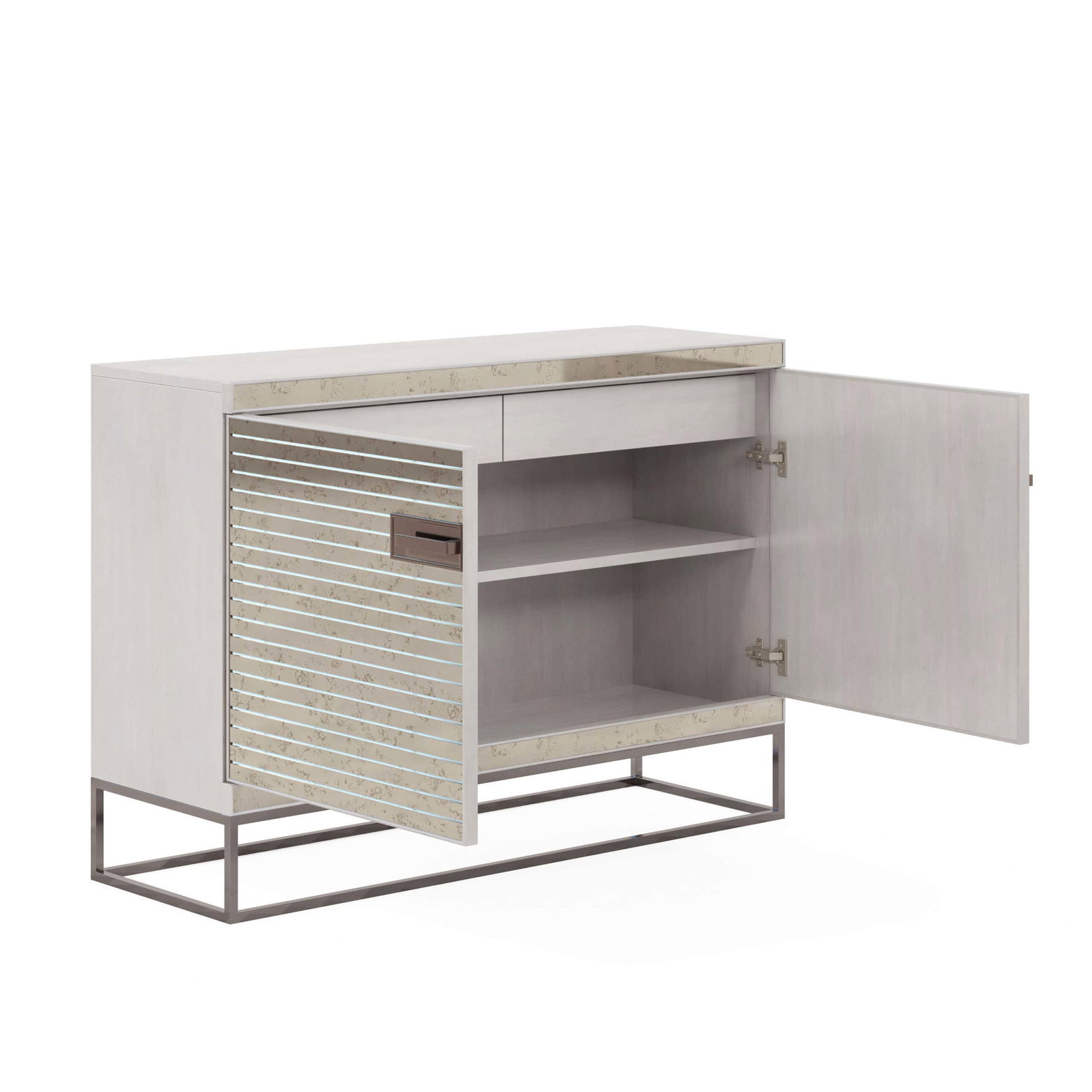 Product Description: ART Furniture 325397-2249 Mezzanine Hall Chest - This versatile storage piece features a pair of doors finished in antiqued mirror, with a horizontally grooved pattern that adds texture and intrigue. Inside, two drawers and an adjustable shelf provide space for any room’s essentials, from linens to accessories. Oversized nickel handles and an open metal base add a touch of metallic shine to this modern chest.