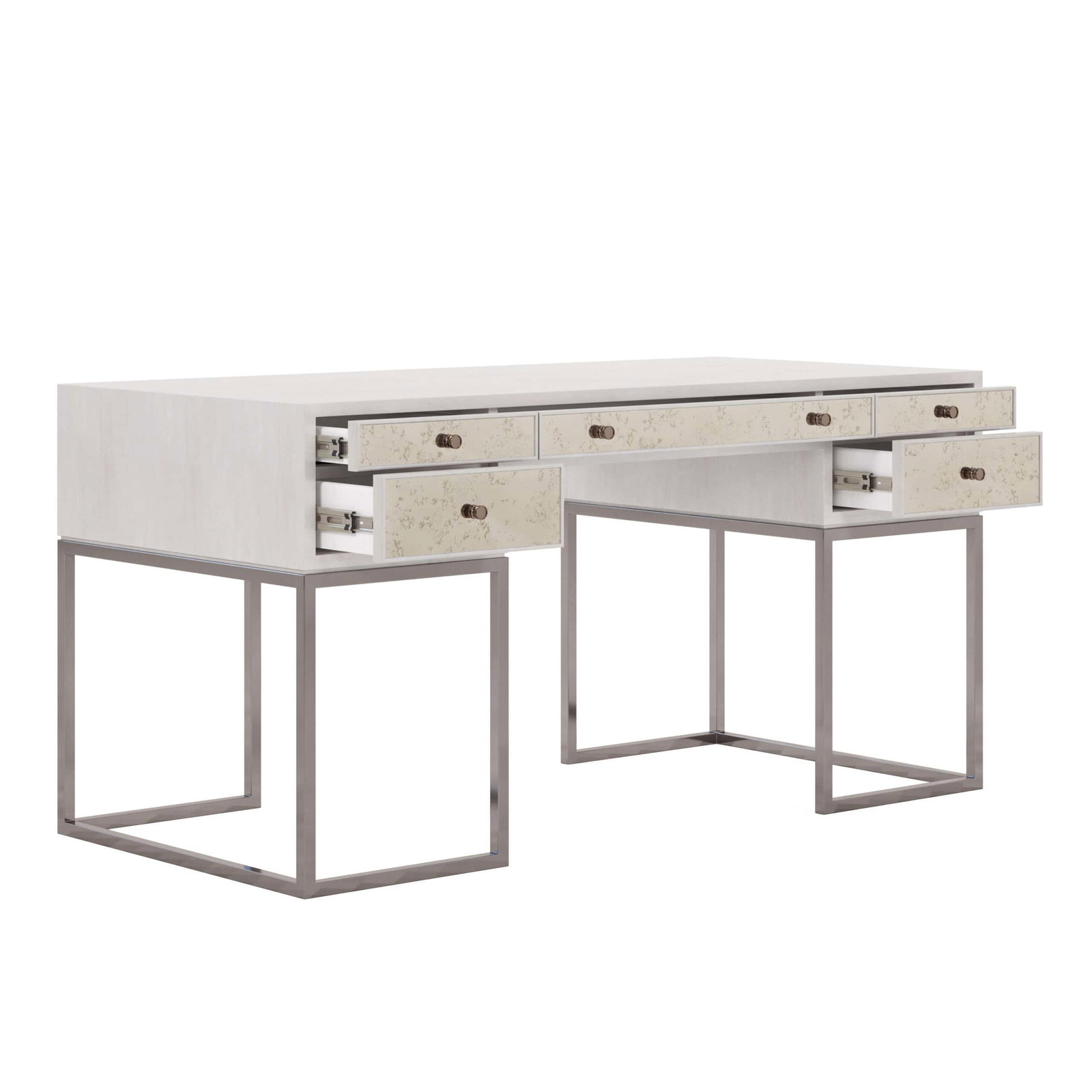 Product Description: ART Furniture 325421-2249 Mezzanine Writing Desk - Vintage elegance meets contemporary chic in this attractive writing desk, highlighting the angular geometry and warm antiqued mirror details that are the hallmark of this collection. The desk is veneered in maple with a dove gray finish and rests on an open metal base, with five drawers that provide convenient storage space for all your office essentials. Or showcase this piece in the bedroom to create a glamorous makeup vanity.
