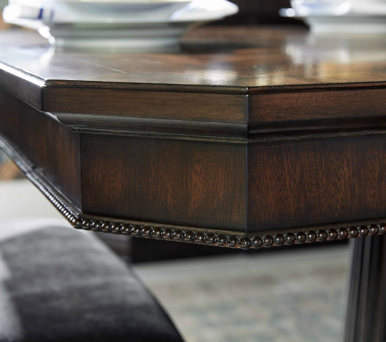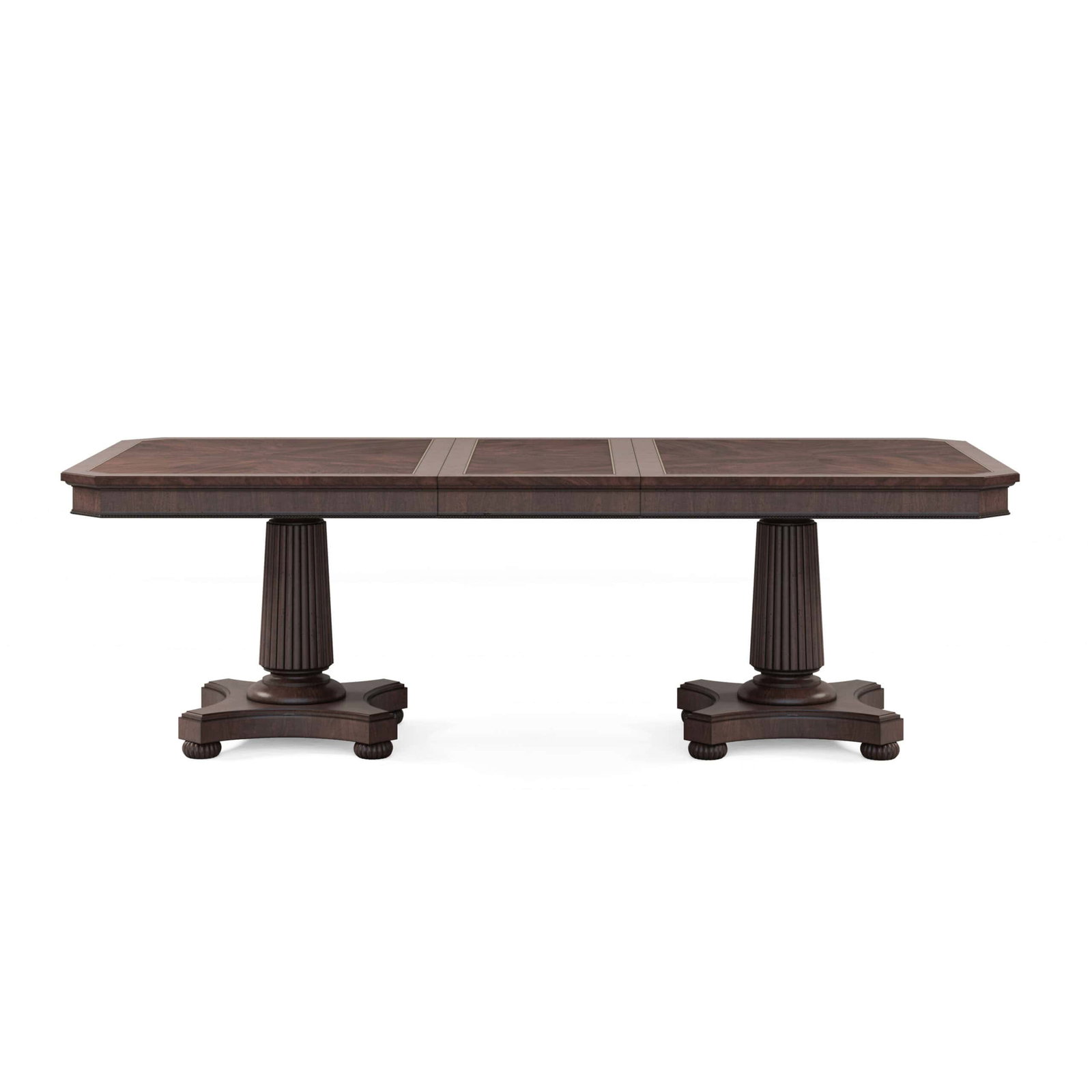 Product Description: ART Furniture 328221-1730 Revival Dual Pedestal Dining Table - With its exquisite design, premium craftsmanship, and versatile functionality, our Revival Dining Table sets the stage for unforgettable dining experiences, creating cherished memories with family and friends for years to come. The tabletop features stunning swirl mahogany veneers, highlighted by contrasting satin wood inlay and canted corners surrounded by an apron adorned with beaded trim. It sits atop a dual pedestal base, featuring two fluted columns on bun feet. Two drawers on either end of the tabletop feature felt-lined bottoms, providing convenient storage for dining essentials such as table linens, silverware, or serving utensils. With the inclusion of two 20-inch leaves, this dining table can easily extend to accommodate up to fourteen chairs.