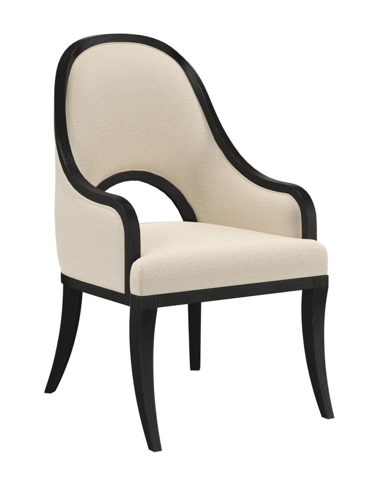 Product Description: ART Furniture 334200-2659 Atrium Hostess Chair - Exposed wood arm chair in blackened sable finish and contrasting beige fabric is as stately as it is comfortable, the hoop is repeated in an open arched space in the back for added elegance.