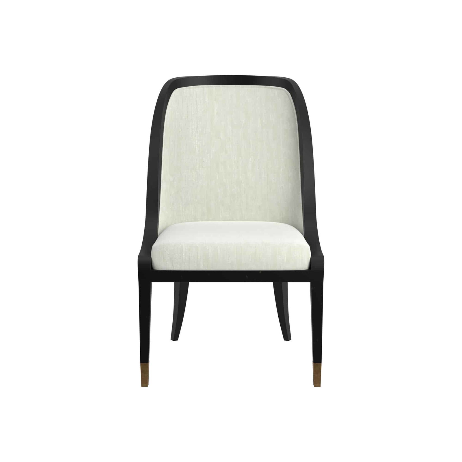 Product Description: ART Furniture 336200-1818 Eave Hostess Dining Chair - New Traditional Slipper Dining Chair with Curved Backrest Upholstered in Ivory Color Polyester Fabric and Natural Cane Outback suppported by tapeed legs in Ink (Ebony Black) finish with brushed gold metal ferules.