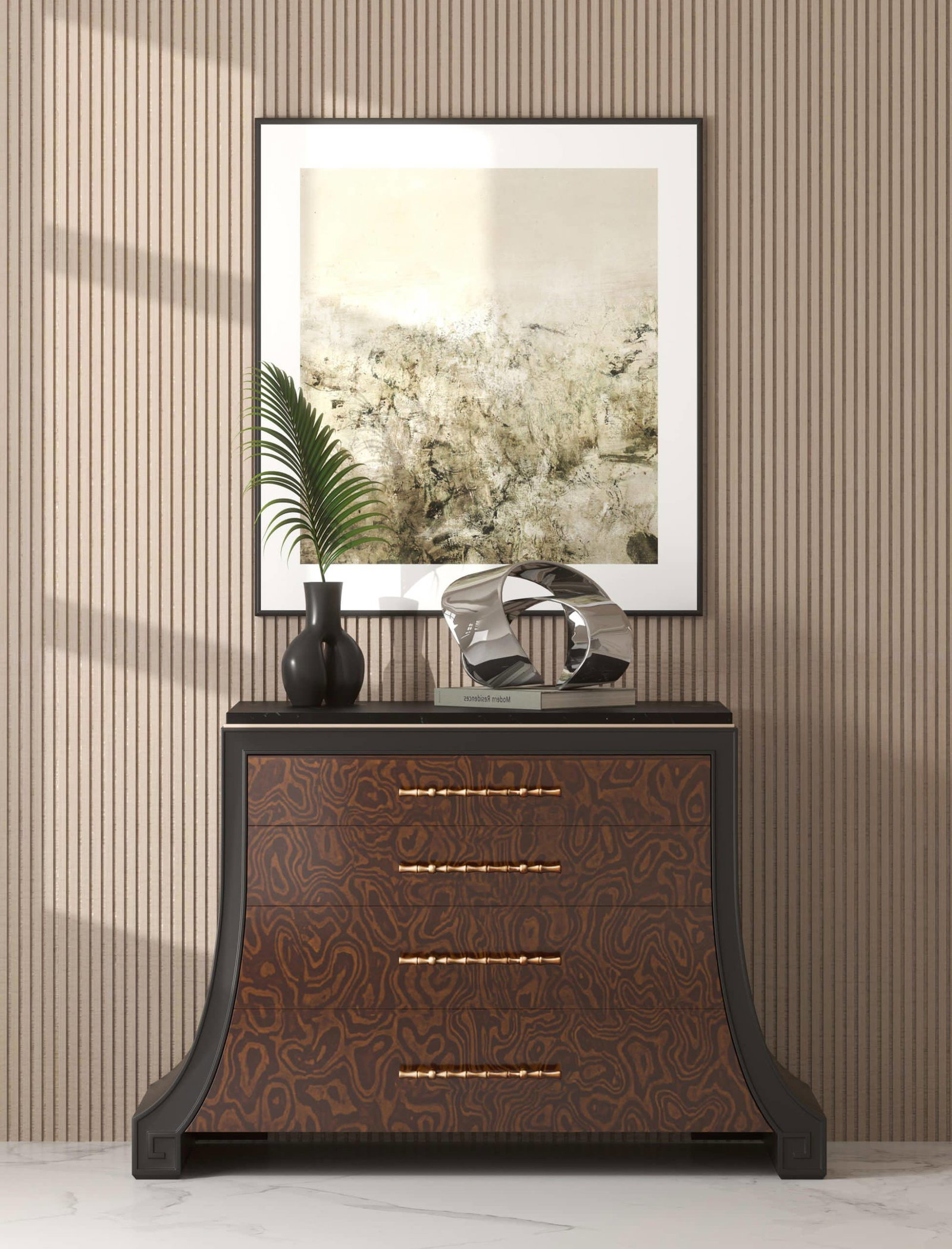 A reinvention of 19th-Century English classics infused with chinoiserie details. Collections features pieces finished in stunning clear quartered walnut veneer, mixed with selected items in Candy Apple Red, Black and Frosted Bronze bridging timeless elegance with modern sophistication
