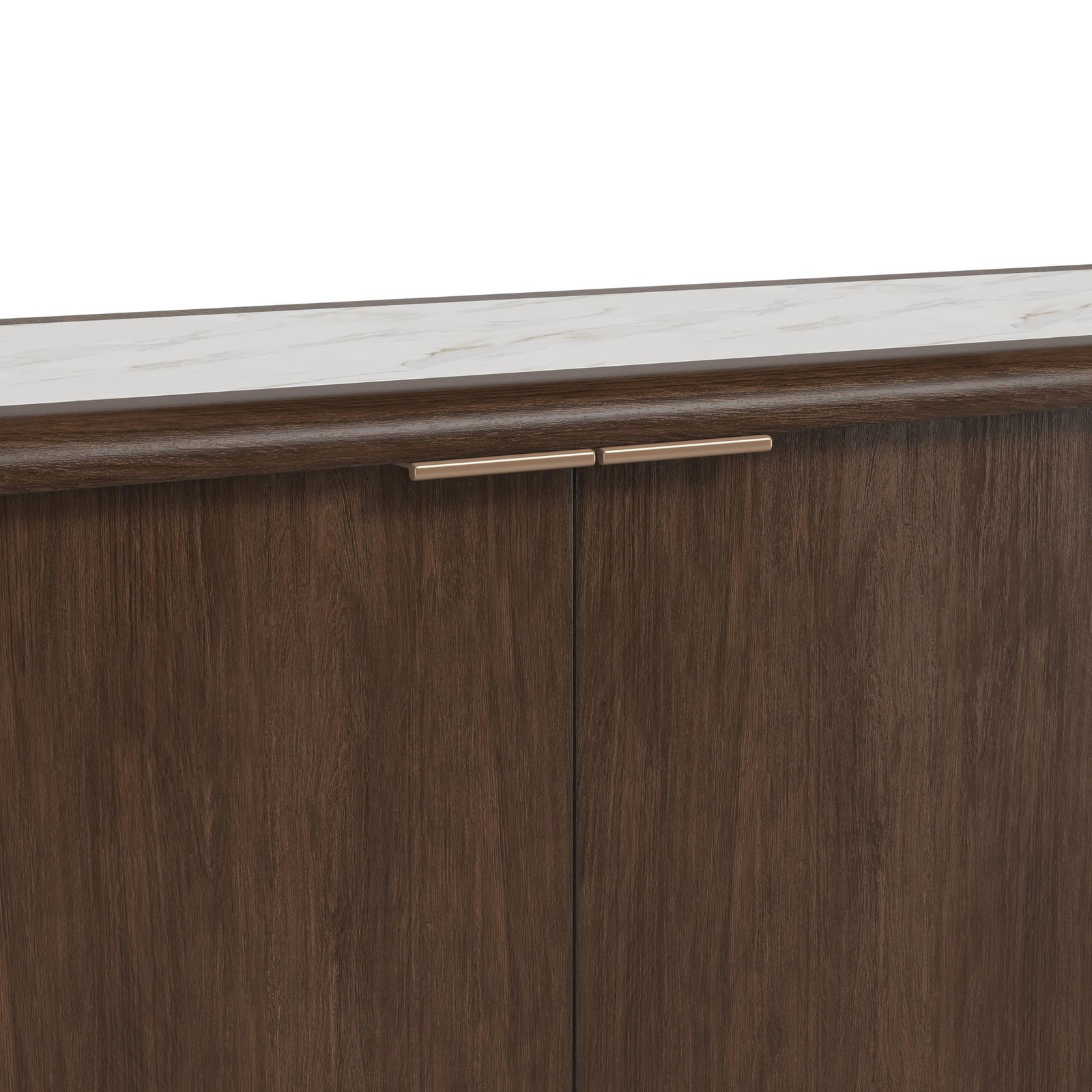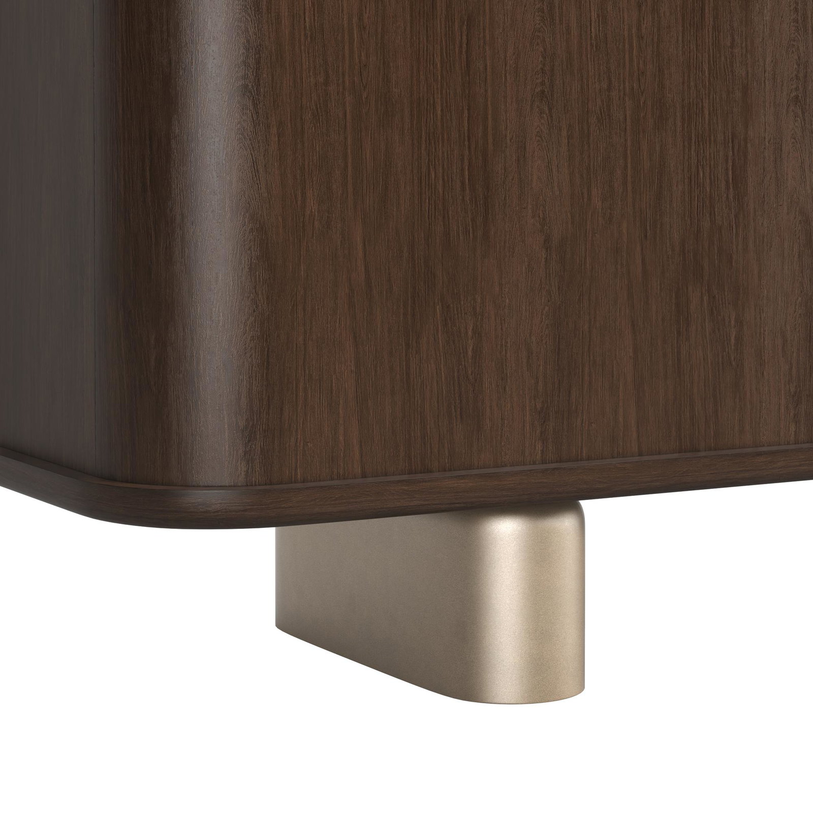 Product Description: ART Furniture 337252-1960 Verge Credenza - Enhance your space with the sophisticated presence of this credenza and let its intriguing design elevate your décor. The unique, handcrafted walnut finish is softened by gently rounded corners framing four sleek doors. Elegant metal handles, with a touch of antique brass, add a subtle yet refined detail. The unique, sculptural metal base provides a modern, floating effect. The clean lines and substantial form offer both storage and style, ensuring this credenza complements its surroundings with its quiet drama. Whether placed in a dining room, living area, or hallway, this credenza is sure to reflect well on its surroundings, offering both functionality and a touch of contemporary elegance