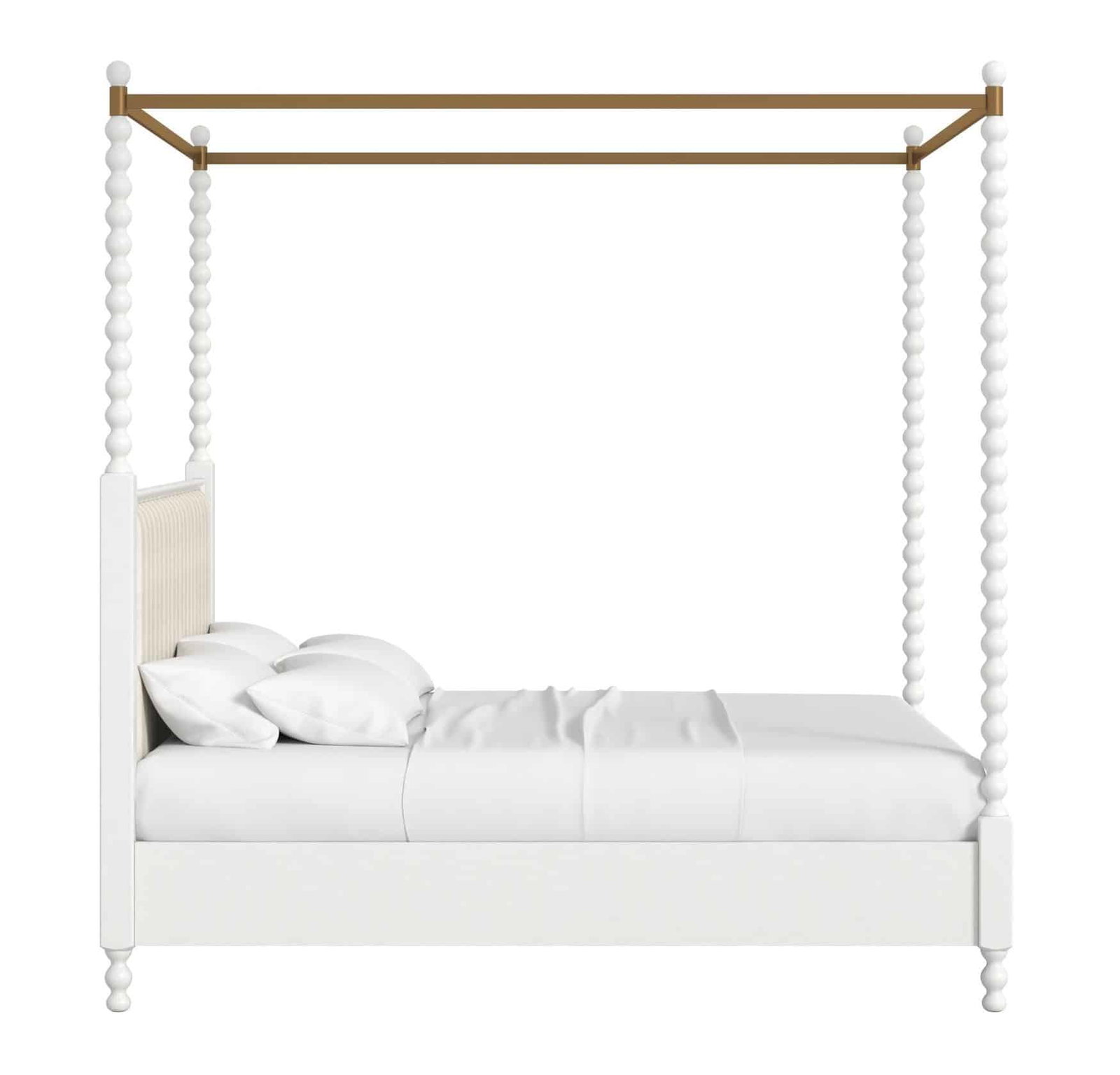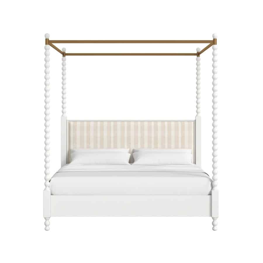 Product Description: ART Furniture 339136-2367CP Haven King Uph Canopy Poster Bed - Elevate your bedroom to a realm of whimsical elegance with the Haven Canopy Bed. This piece reimagines the classic canopy silhouette with a light and airy touch, reminiscent of a sun-drenched cottage garden. The delicate white spindles, reminiscent of vintage craftsmanship, rise to support a soft, golden canopy frame, creating an enchanting focal point. The upholstered headboard, with its subtle texture, adds a touch of refined comfort, while the gently turned feet echo the timeless beauty of antique finds. Transform your sleeping space into a serene retreat with this captivating bed, a true embodiment of the Haven collection's inviting charm.