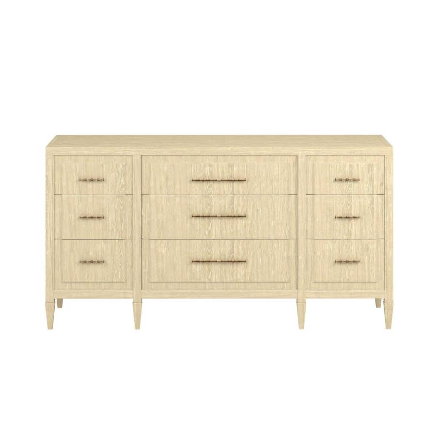 Product Description: ART Furniture 436131-1825 Eave Dresser - Introduce a sense of refined tranquility to your bedroom with the Eave II Dresser. This piece, from the esteemed Eave II collection, combines classic design with a modern, minimalist aesthetic. The dresser features a clean, linear silhouette, showcasing the natural beauty of the light-toned wood finish. The six spacious drawers, accented with sleek, elongated hardware, offer ample storage while maintaining a streamlined appearance. The central drawers are subtly framed, adding a touch of architectural detail and visual interest. The dresser rests on elegantly tapered legs, elevating the piece and enhancing its sophisticated profile. The Eave II Dresser is designed to be a functional and stylish focal point, bringing a sense of calm and understated elegance to your personal space.
