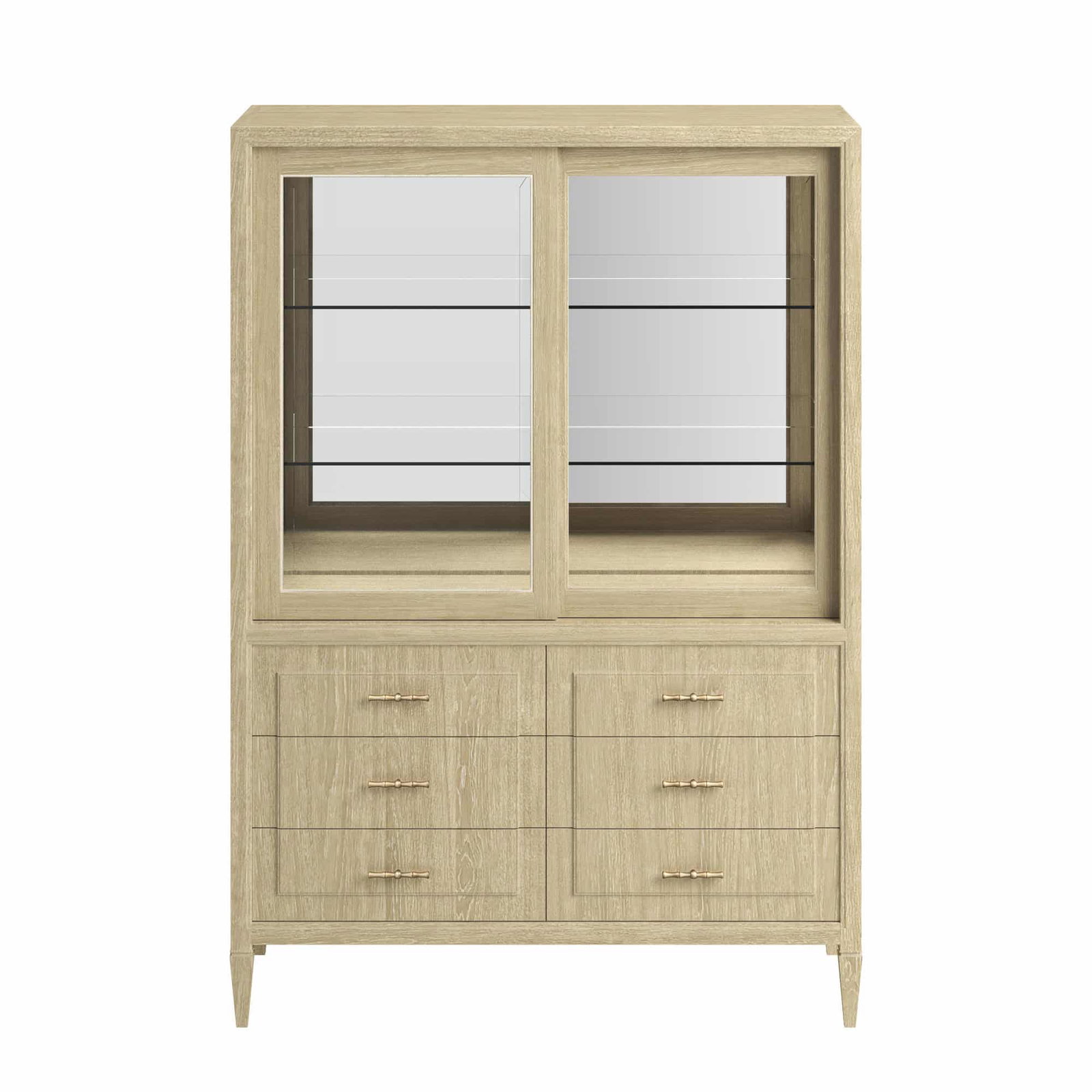 Product Description: ART Furniture 436240-1825 Eave China Cabinet - Elevate your dining or living space with the refined elegance of the Eave II China Cabinet. This piece, from the esteemed Eave II collection, combines classic design with modern functionality. The cabinet features a clean, rectilinear silhouette crafted from a light, natural wood that exudes a sense of calm and sophistication. The upper section of the cabinet showcases your cherished items through sleek, sliding glass doors, providing a contemporary display option. The interior features adjustable glass shelves, allowing for customizable storage and display. The lower section of the cabinet offers ample storage with six drawers, each accented with unique, elongated hardware that adds a touch of textural interest and visual appeal. The cabinet's design is further enhanced by its gently paneled drawer fronts and sides, creating a sense of depth and architectural detail. The piece rests on elegantly tapered legs, adding a touch of lightness and sophistication to its overall profile. The Eave II China Cabinet is designed to be a stylish and functional centerpiece, blending timeless design with modern practicality.