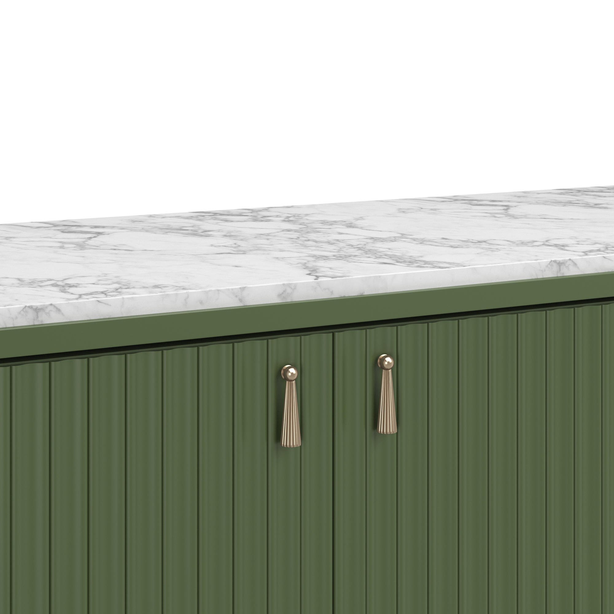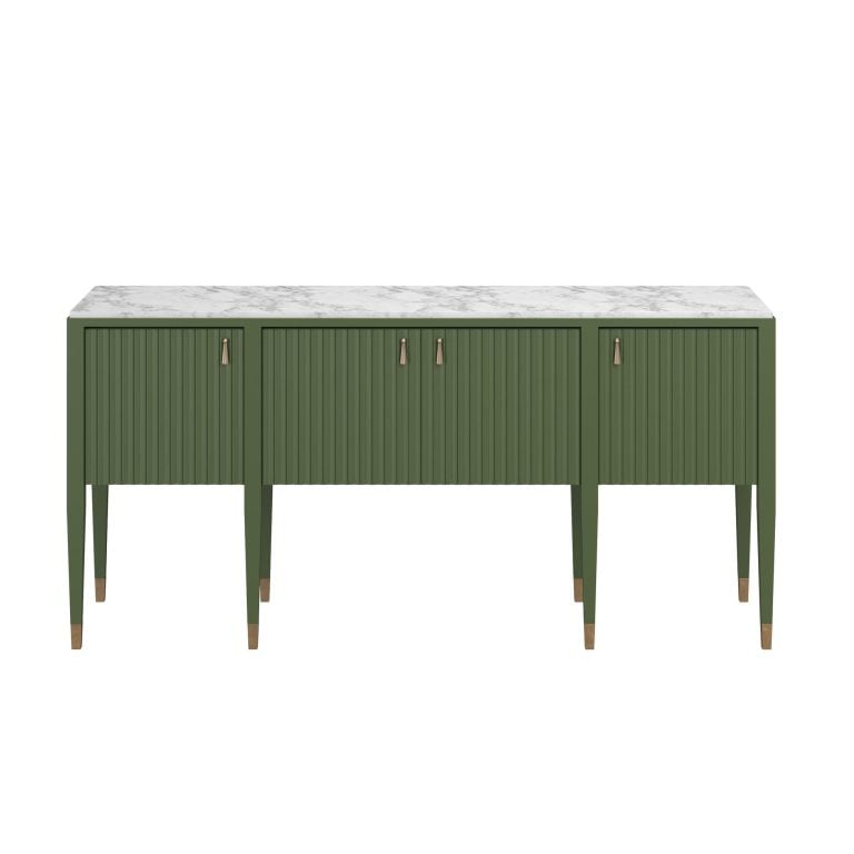 Product Description: ART Furniture 436251-1865 Eave Sideboard with Stone Top Darkened Sage - Introduce a touch of bold elegance and sophisticated functionality to your dining or living space with the Eave II Sideboard. This piece, from the esteemed Eave II collection, showcases a striking design with a rich, painted finish that adds a pop of color and personality to your interior. The sideboard features a smooth, luxurious marble top, providing a beautiful and durable surface for serving and display. The cabinet doors and drawers are adorned with a unique, vertical ribbed texture, adding a textural element and visual interest. The sleek, elongated hardware complements the contemporary design. The sideboard offers ample storage with its cabinet space and drawers, making it perfect for organizing dining essentials, linens, or media components. The piece rests on slender, tapered legs with metallic accent tips, adding a touch of refined elegance. The Eave II Sideboard is designed to be a statement piece, blending unique design with everyday functionality in a bold and sophisticated palette.