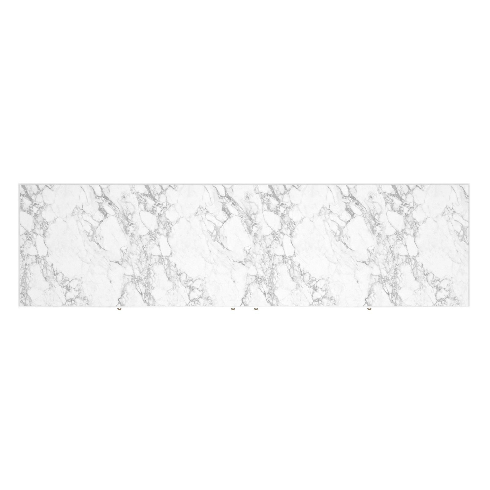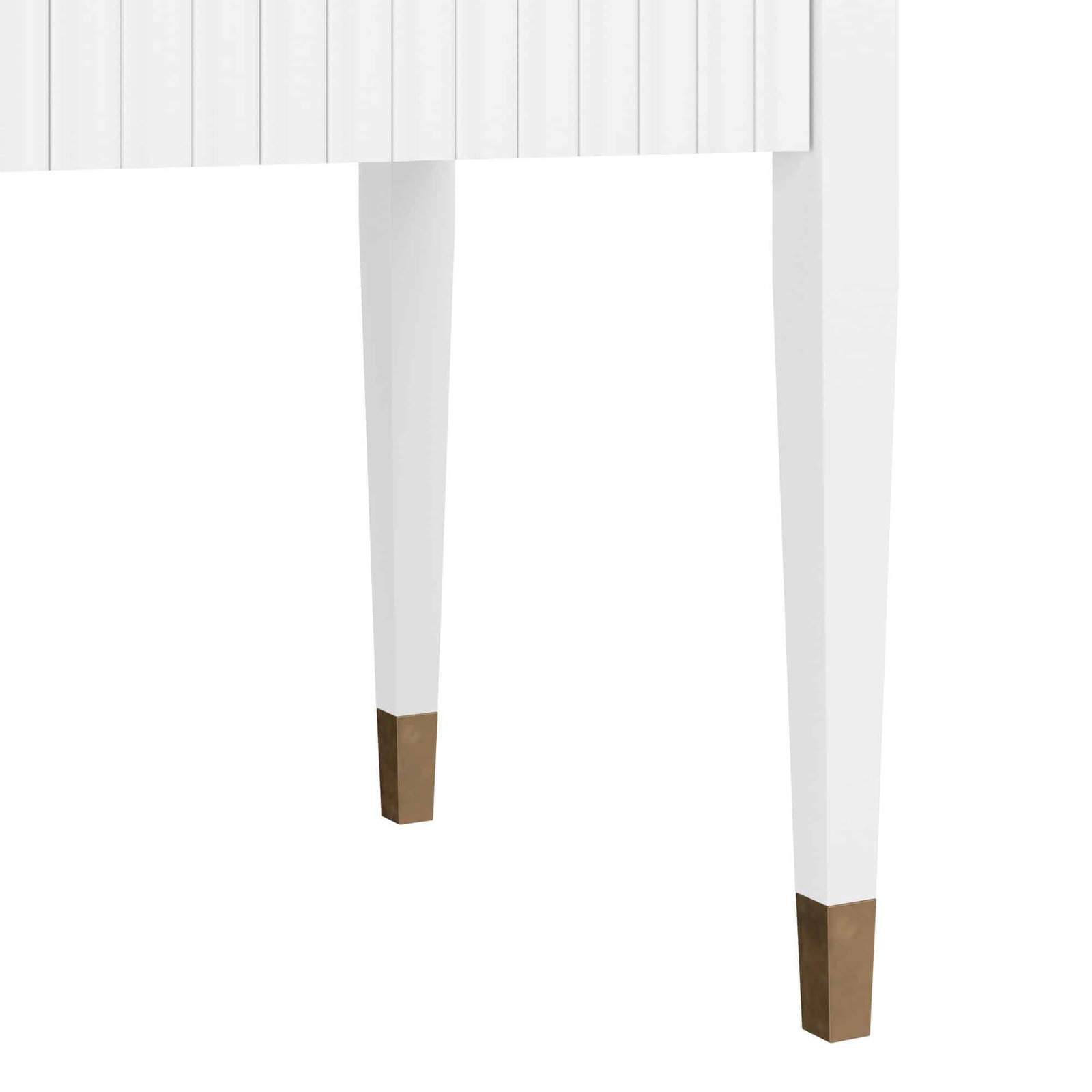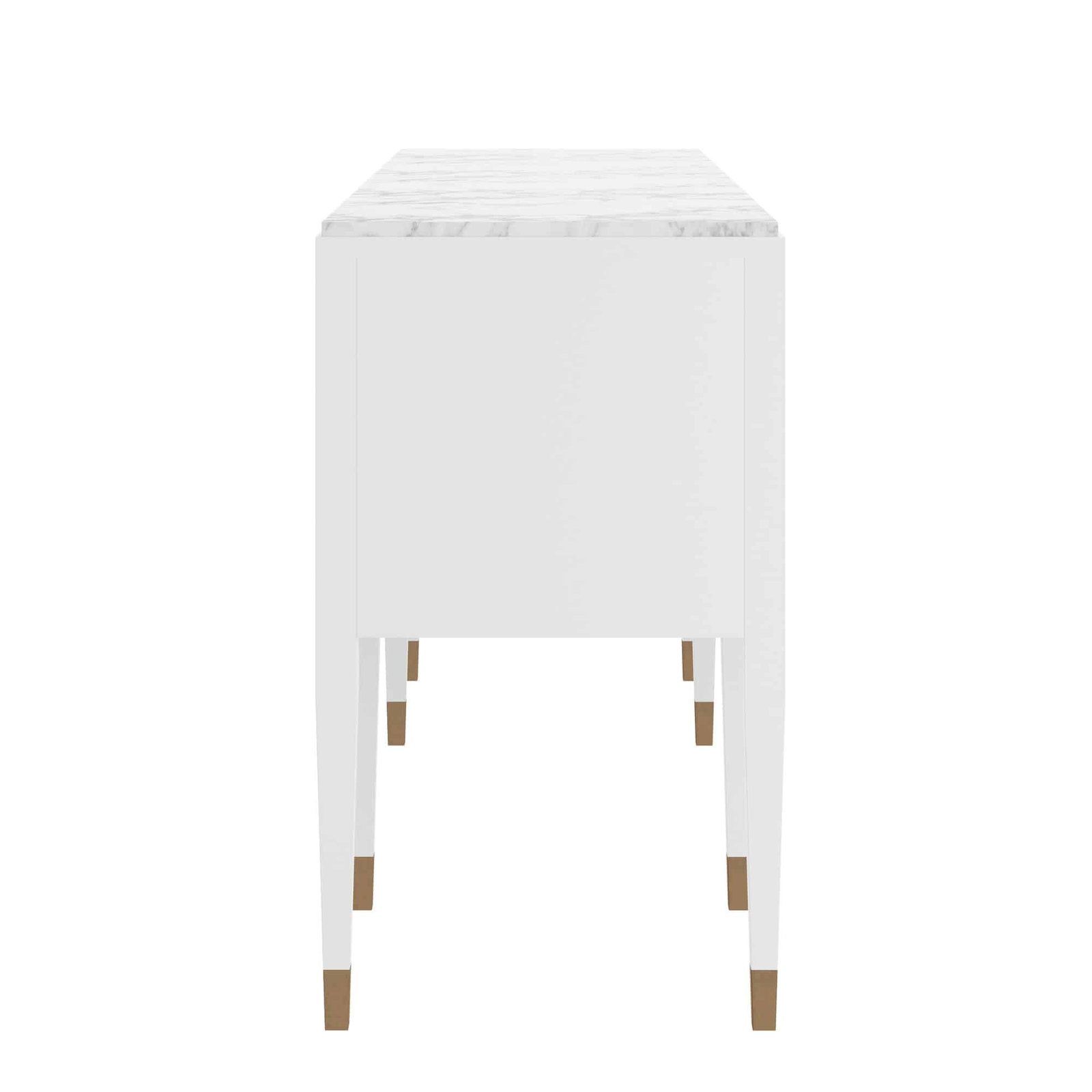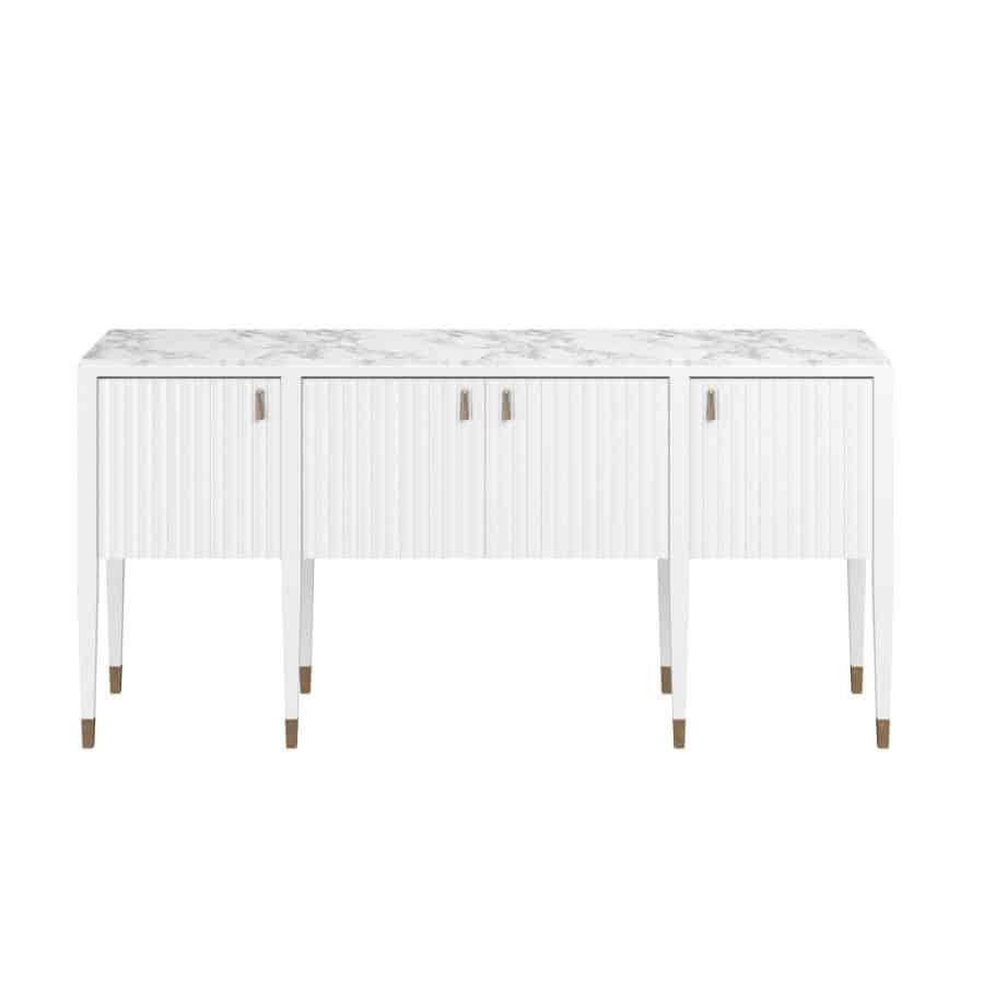 Product Description: ART Furniture 436251-1866 Eave Sideboard with Stone Top Uplifting White - Introduce a touch of sophisticated elegance and modern functionality to your dining or living space with the Eave II Sideboard. This piece, from the esteemed Eave II collection, showcases a striking design in a crisp, clean white finish that brightens any interior. The sideboard features a smooth, luxurious marble top, providing a beautiful and durable surface for serving and display. The cabinet doors and drawers are adorned with a unique, vertical ribbed texture, adding a textural element and visual interest. The sleek, elongated hardware complements the contemporary design. The sideboard offers ample storage with its cabinet space and drawers, making it perfect for organizing dining essentials, linens, or media components. The piece rests on slender, tapered legs with metallic accent tips, adding a touch of refined elegance. The Eave II Sideboard is designed to be a statement piece, blending unique design with everyday functionality in a fresh, contemporary palette.