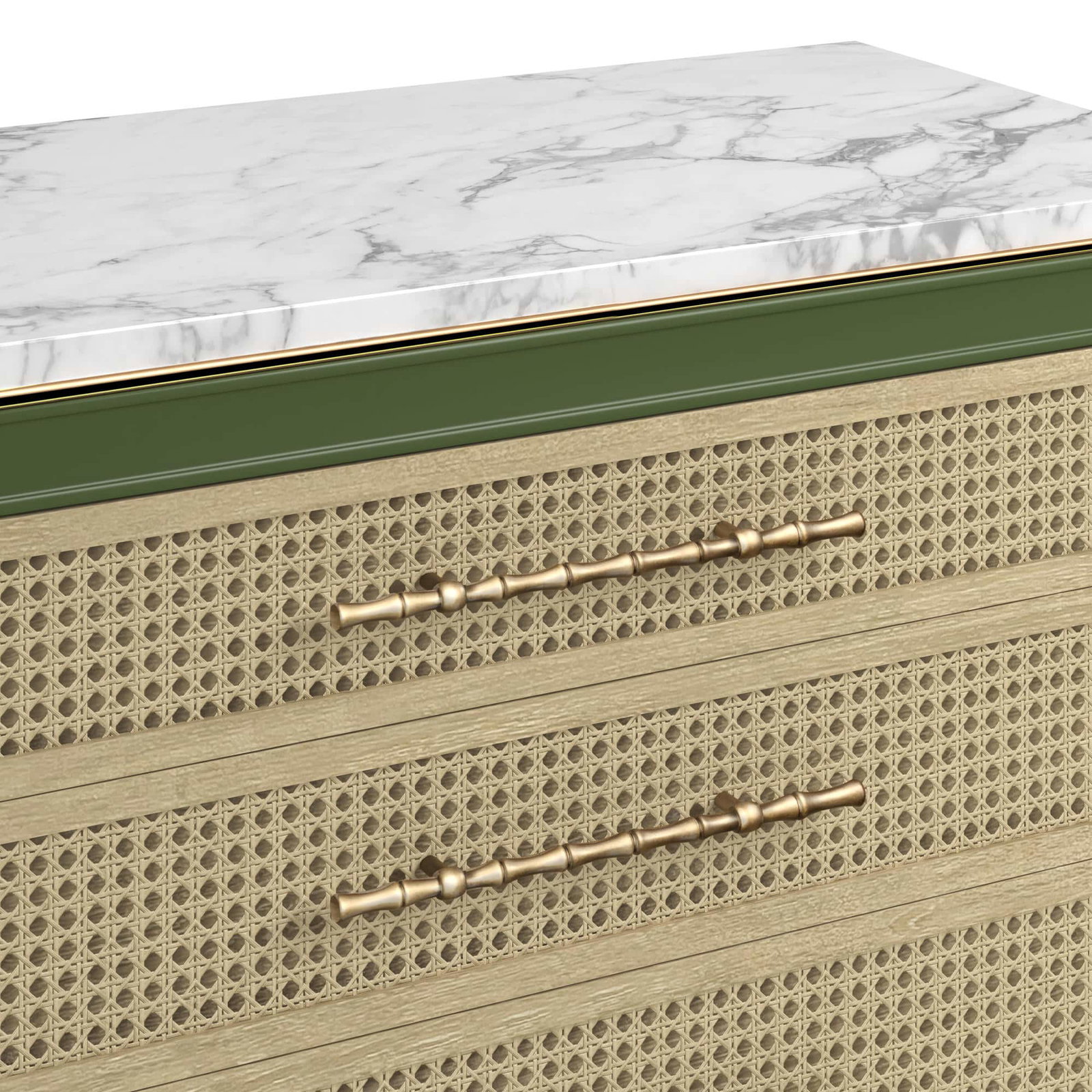 Product Description: ART Furniture 436397-1865 Eave Accent Chest Darkened Sage - New Traditional Accent Chest with two tone finish: Darkened Sage sides, top and legs and Cane finished drawer fronts with faux bamboo handles in Burnished Gold. Top in Marble