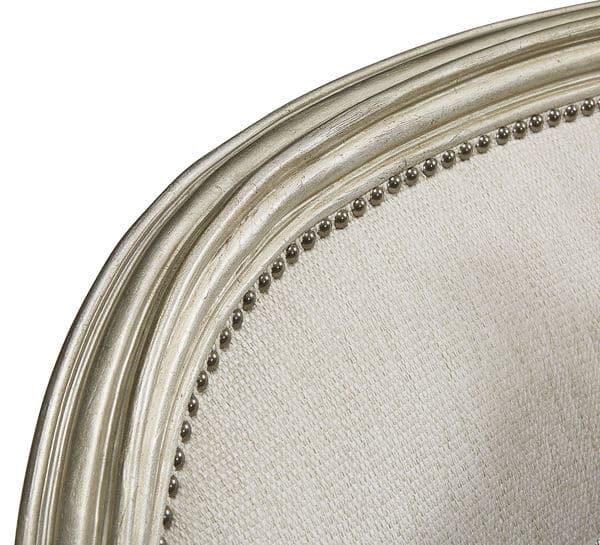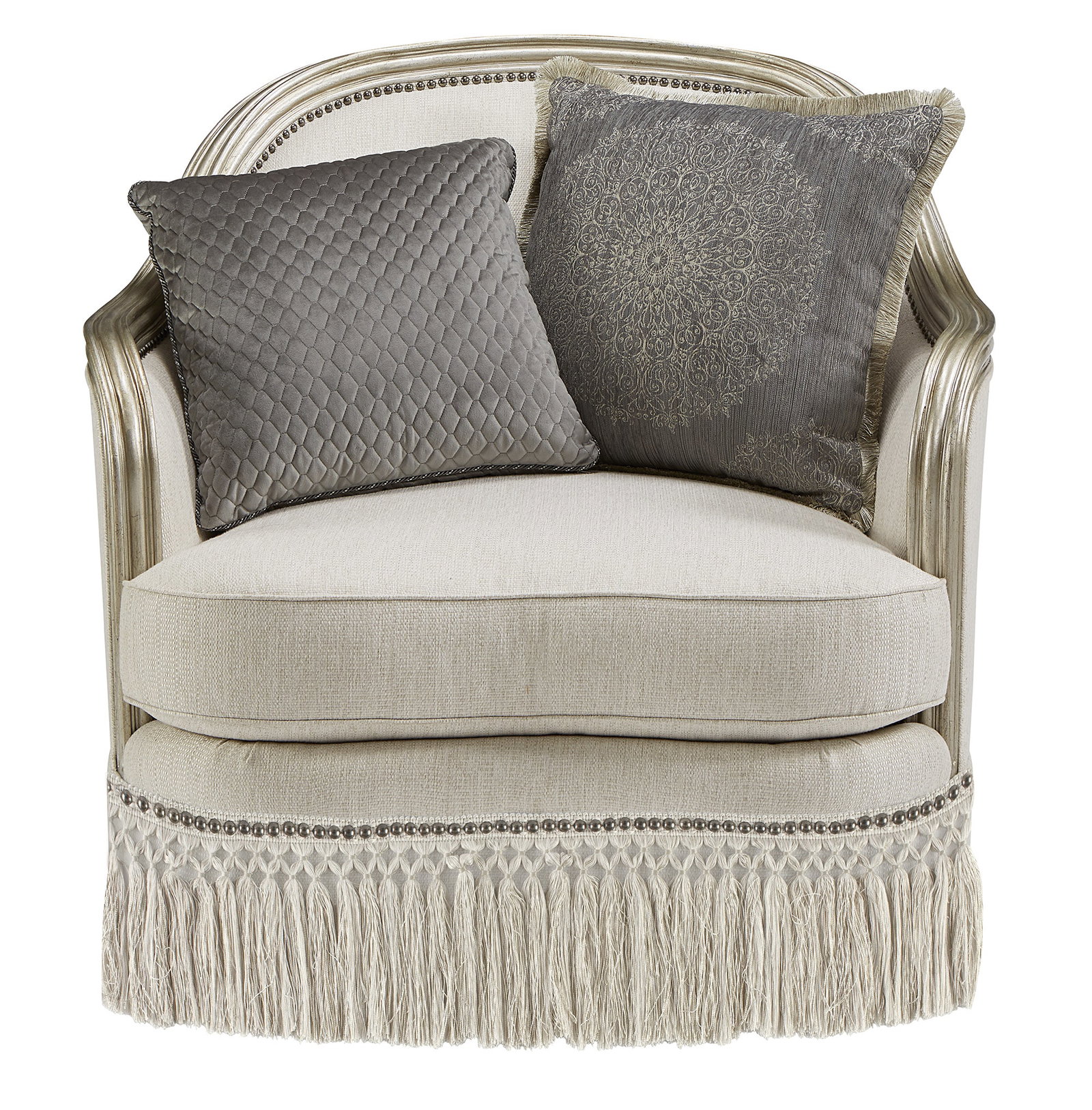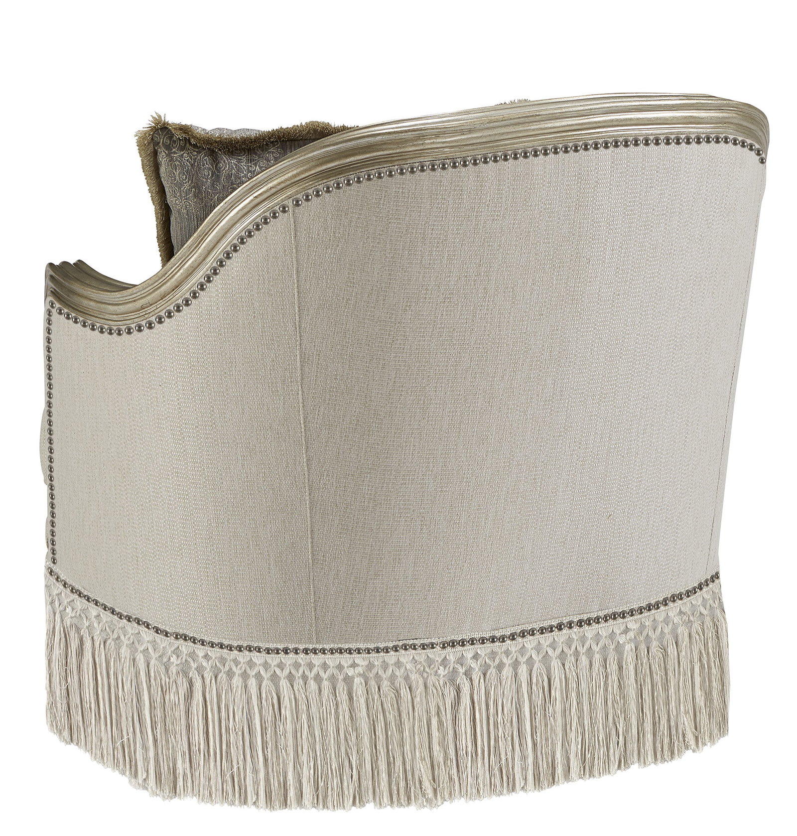 Product Description: ART Furniture 509503-5727AB Giovanna Bezel Matching Chair - Elegantly curved along the front and the exposed-wood & resin shaped back and arms, the Giovanna Bezel Matching Chair is a masterpiece of old school luxe. The frame’s rich glam finish is accented with silver, and the chair is upholstered in a soft touch woven and features a down blend-filled seat cushion, hand-applied nail head trim, self welting and a deep skirt of matching bullion fringe. The chair comes with two down blend-filled toss pillows in coordinating fabric and trim.