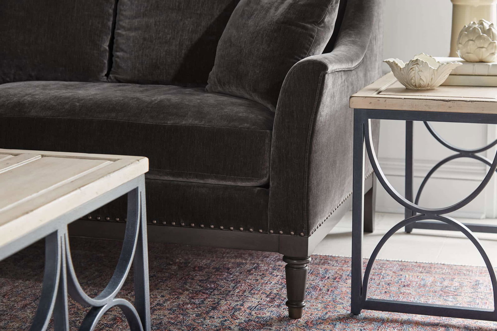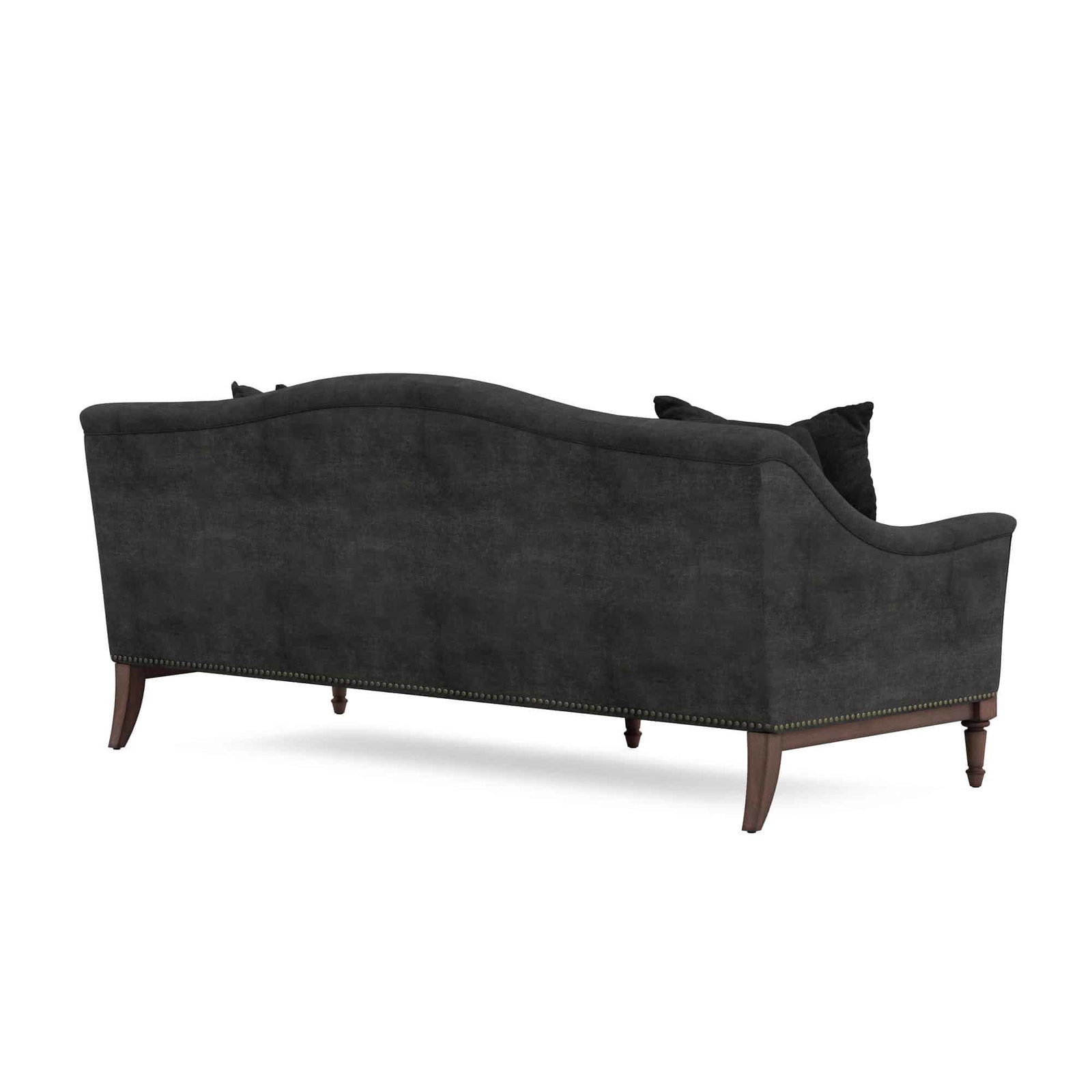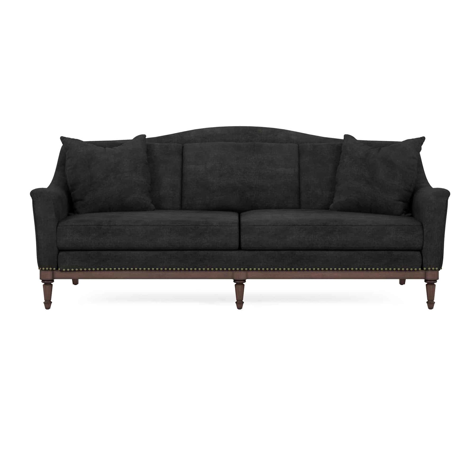 Product Description: ART Furniture 528501-1730AA Magritte Sofa Charcoal - A classic camel back style sofa, Magritte offers timeless seating at a value. Featuring a 3 over 2 cushion configuration, this generously sized sofa offers a stylish lounging space without sacrificing comfort. Accented with a deep brown wood base, fully turned front gets and antique brass nailhead trim, Magritte has all the makings of an updated traditional aesthetic. Its velvet charcoal upholstery grounds your living space, while two included toss pillows offer extra comfort when desired.