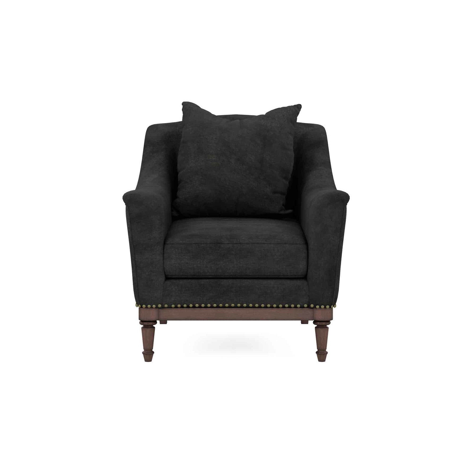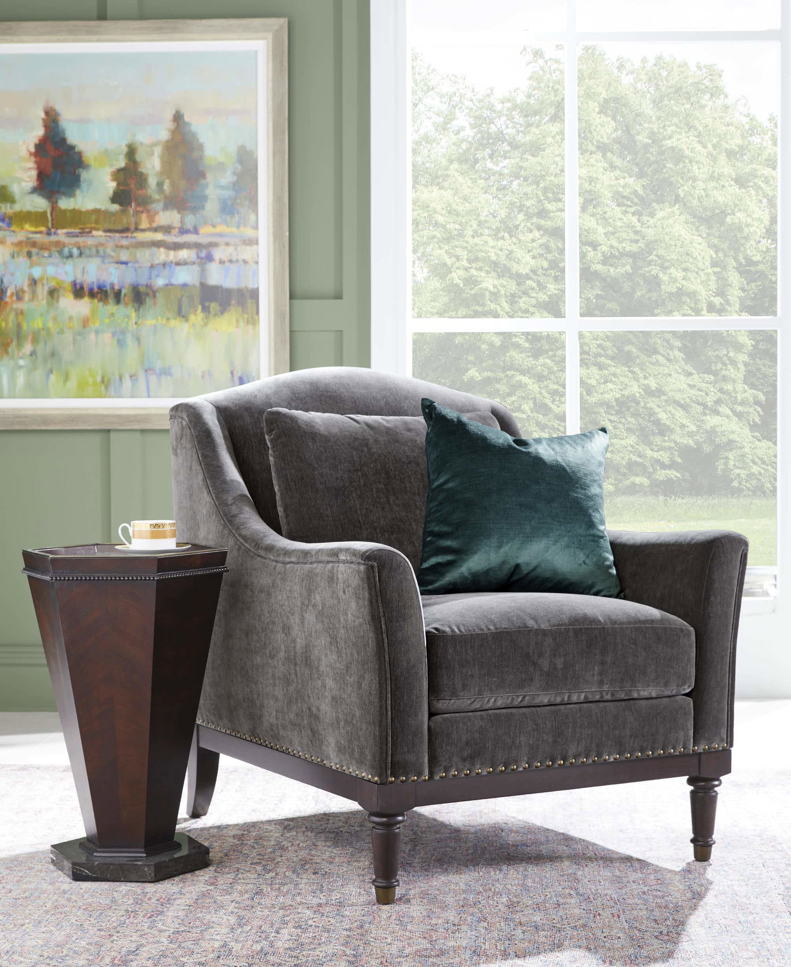 Product Description: ART Furniture 528503-1730AA Magritte Accent Chair Charcoal - The Magritte Lounge Chair is a classic in the making. Featuring a deep brown wood base, fully turned front legs, and antique brass nailhead trim, this charming chair is versatile and timeless. Its camel back silhouette is upholstered in a rich, velvety fabric that features a lustrous sheen, adding an air of understated elegance to your space. Perfect on its own or in pairs, this chair is sure to become your favorite seat in the house!