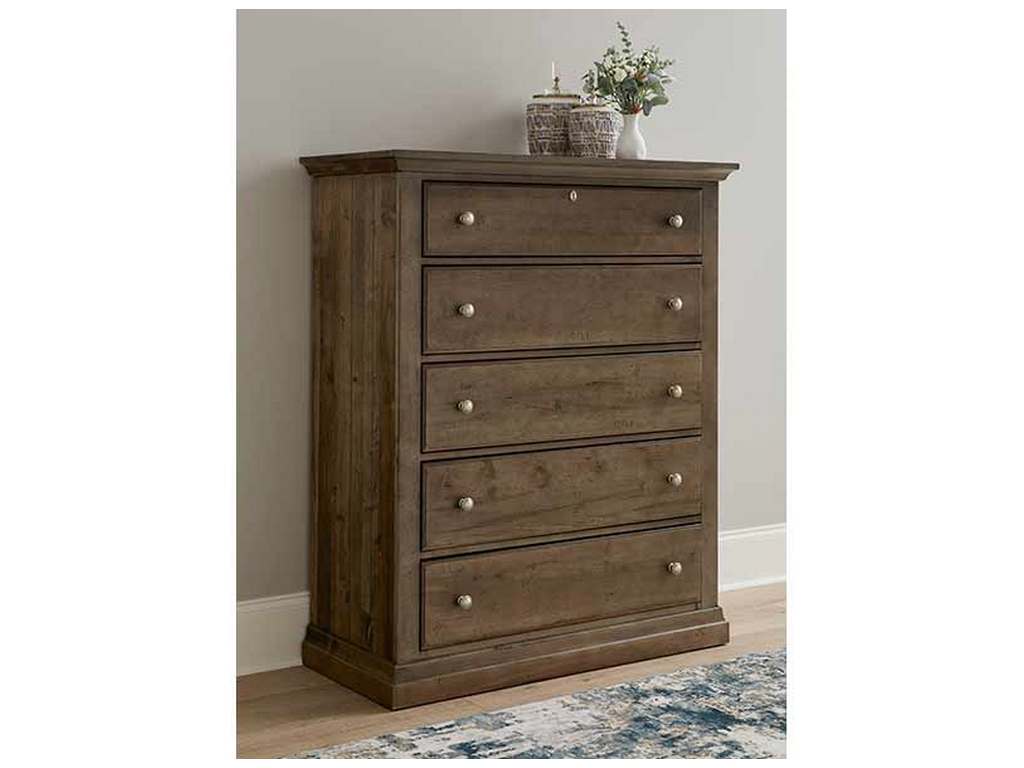 Product Description: Artisan and Post 156-115 Carlisle Chest Dark Sable - Add versatile and stylish storage to your bedroom with this five drawer chest. 2 inch solid maple tops with planked end panels that display a patchwork of stunning streaks; wormholes; and graining. Oval key escutcheon plate on the top drawers with a vintage nickel drawer pull.
