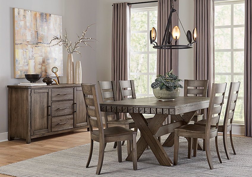 Dovetail Dining Made in the USA by over 500 craftsmen and craftswomen in the factory in the Virginia mountains using American Oak solids. Dovetail Dining collection is designed for those who appreciate a natural reclaimed wood look. The splits, cracks, knots, and bold grain pattern is achieved through ATAP technology (Accelerate the Aging Process). Until now only Mother Nature could make wood look this good.