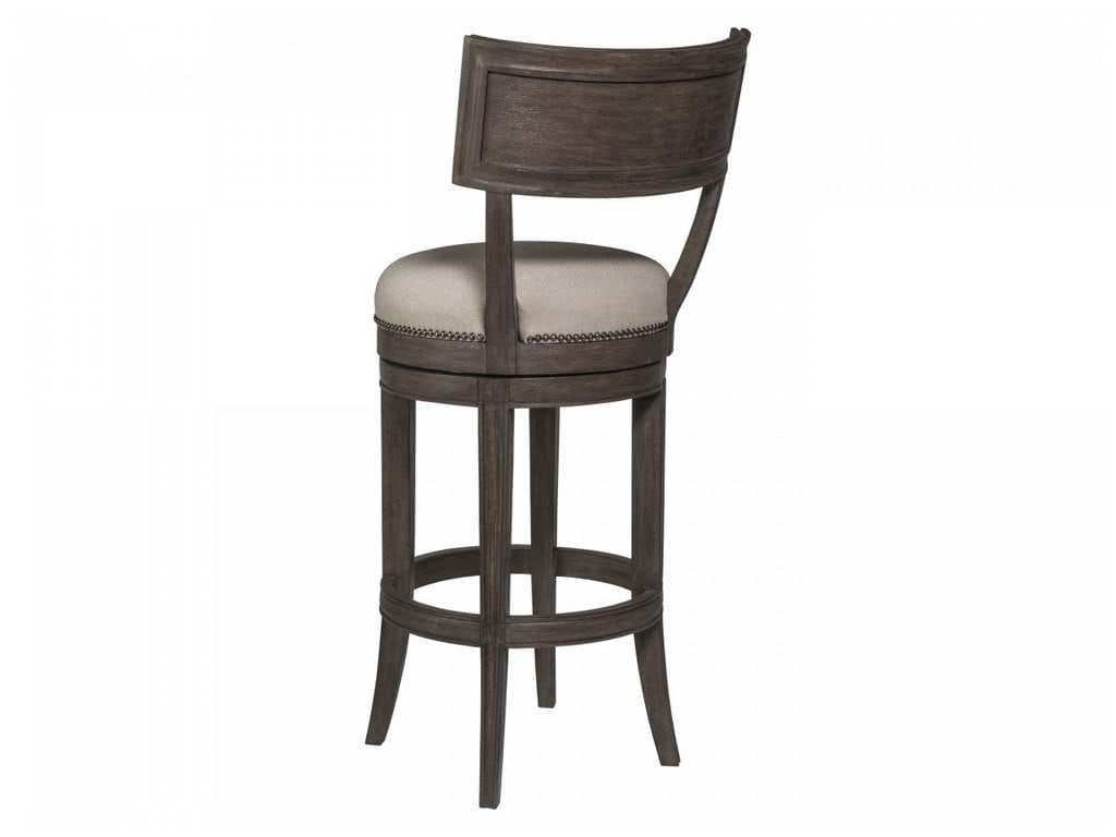 Product Description: Artistica Home 2000-896-39-01 Cohesion Program Aperitif Swivel Bar Stool - A traditional design bar stool crafted from mahogany veneers, bleached mahogany, and select hardwoods in the Antico finish with hand wire brushing. The upholstered back splat and memory swivel seat are available in a linen and cotton blend fabric with a soft hand in a natural greige coloration, fabric 153671. The decorative nailhead trim and kickplate are finished in a warm metallic with a hint of copper. The bar stool is available in all Cohesion finishes.
