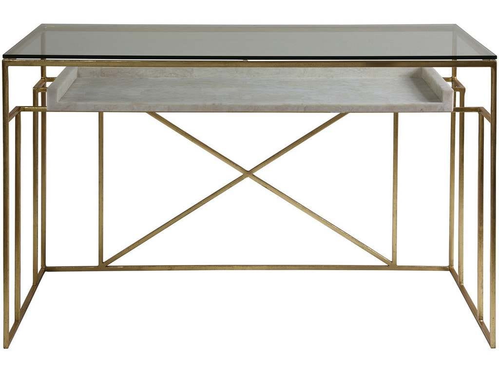Product Description: Artistica Home 2024-933C Signature Designs Cumulus Writing Table - Iron base frame in gold foil finish with a tempered glass writing surface, and fossilized white crystal stone floating shelf. The stone will vary from piece to piece.