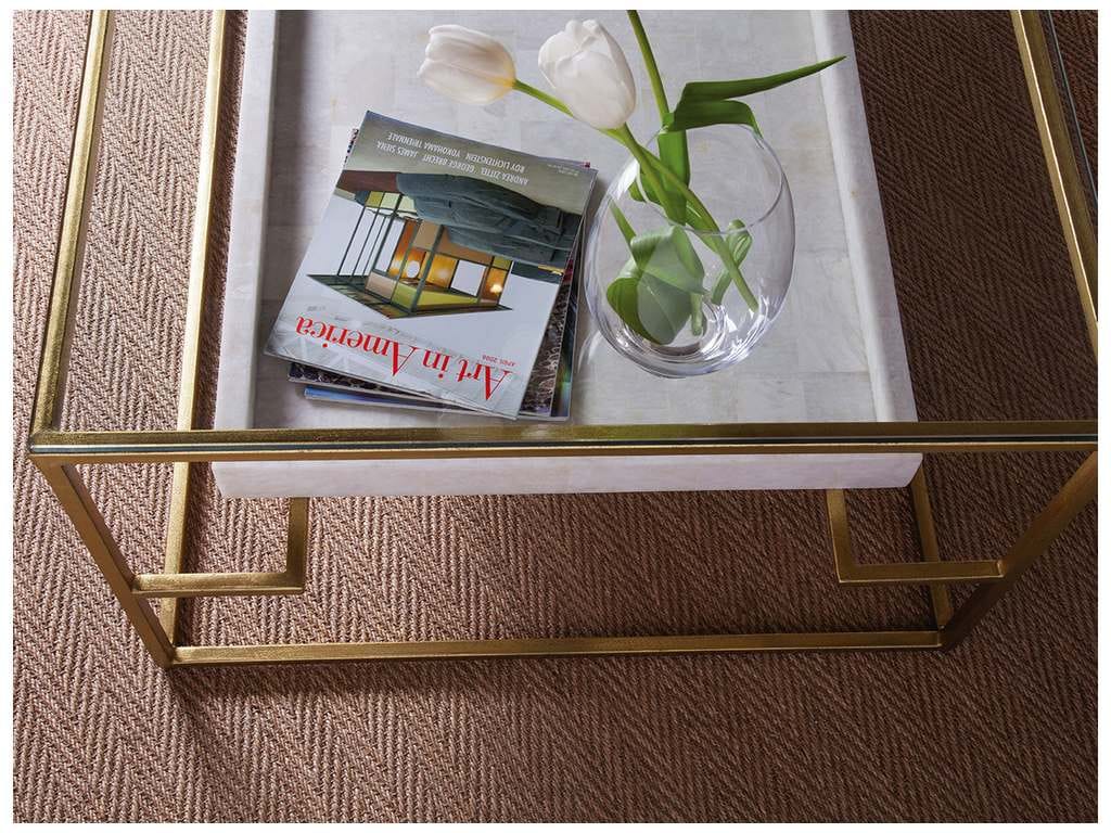 Product Description: Artistica Home 2024-945C Signature Designs Cumulus Rectangular Cocktail - Iron base frame in gold foil finish with tempered glass top and fossilized white crystal stone floating shelf. The stone will vary from piece to piece.