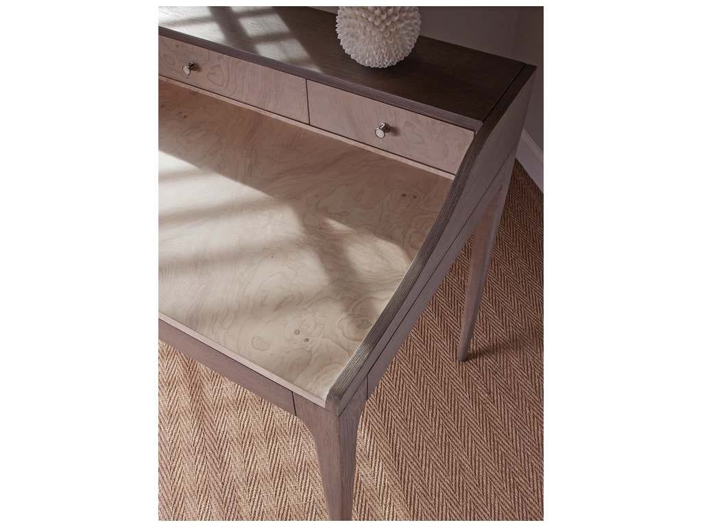 Product Description: Artistica Home 2025-933 Signature Designs Mercury Desk - Bleached olive ash burl veneer on writing surface and the three drawer fronts, white oak veneers and select hardwoods. Solid brass hardware with nickel plating and shell inserts, tapered legs. Gallery consists of left door wire management cubby, and drawers center and right.
