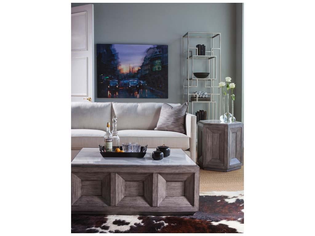 Product Description: Artistica Home 2034-945 Signature Designs Dictum Rectangular Cocktail Table - Solid Italian silver white travertine sits atop a gray wire-brushed finished Mahogany base with recessed panels creating visual depth and interest.