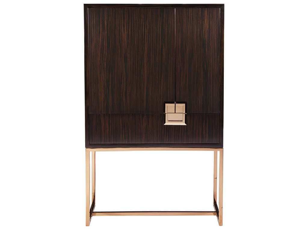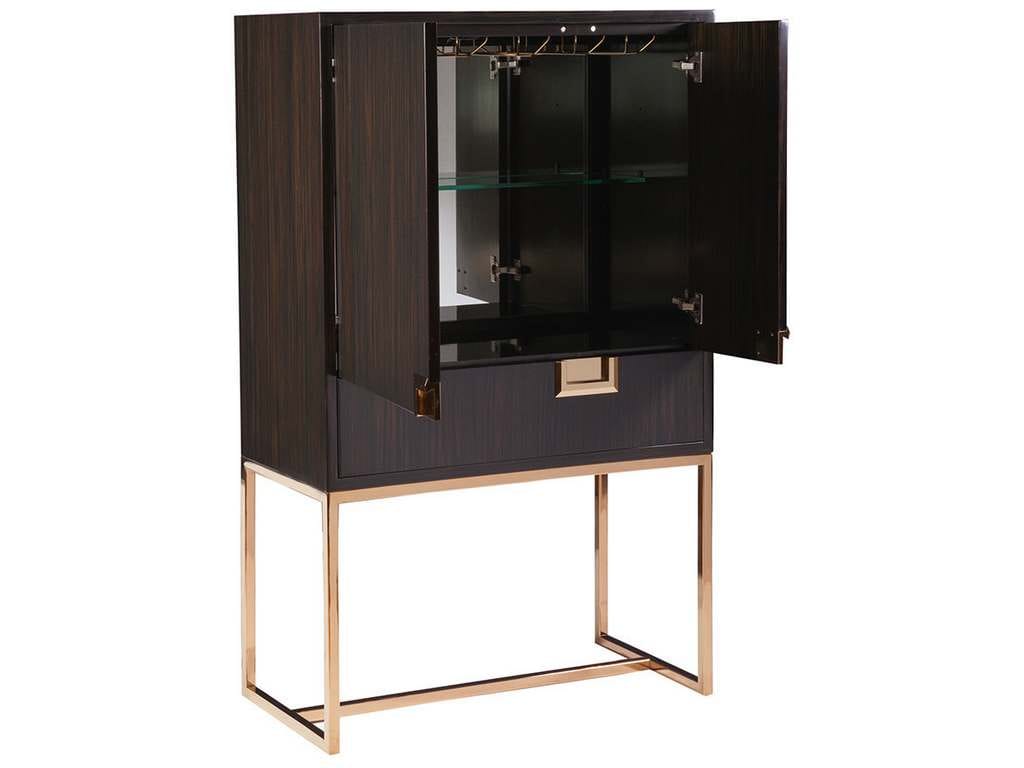 Product Description: Artistica Home 2043-961C Signature Designs Casanova Bar Cabinet - Contemporary design, with deck engineered in ebony veneers. The solid brass hardware complements the stainless steel base electroformed in brass. Note brass will show slight imperfections and polishing marks. Features include two doors, one drawer, and one adjustable glass shelf, with wine glass storage racks.