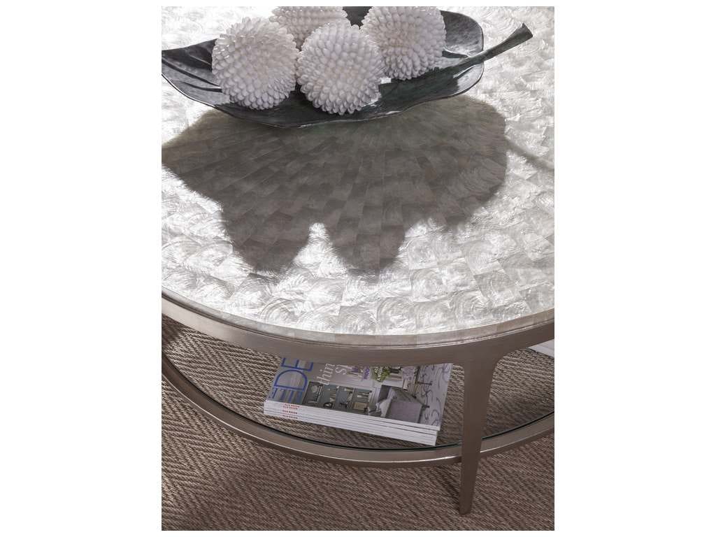 Product Description: Artistica Home 2050-943C Signature Designs Gravitas Round Cocktail Table - Capiz shell inlay top graduating to a center sunburst pattern sitting on a hand-forged iron base in a champagne foil finish, with a tempered inset glass shelf below. Shell is a product of nature and may vary from piece to piece.