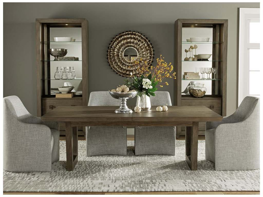 Product Description: Artistica Home 2058-877-41 Cohesion Program Brio Rectangular Dining Table - Tapered sled bases and a thick chamfered top edge give the Brio Rectangular Table its stately architectural form as a centerpiece for a range of Cohesion chair designs. Mahogany solids and veneers in a straight grain pattern on the top with hand wire brush graining in the Grigio finish, a warm gray tone. The 88-inch rectangular table extends to 124 inches with the two 18-inch leaves, comfortably seating twelve, supported by open rectangular block legs. Available in all Cohesion finishes.