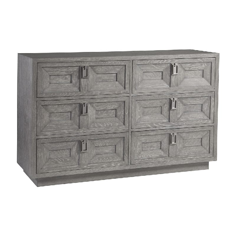 Modern Jacobean designs crafted from white oak and mahogany solids, and quartered white oad veneers featuring a hand wire brushed cerused gray finish and brushed nickel hardware. The six drawers are full-extension and self-closing.