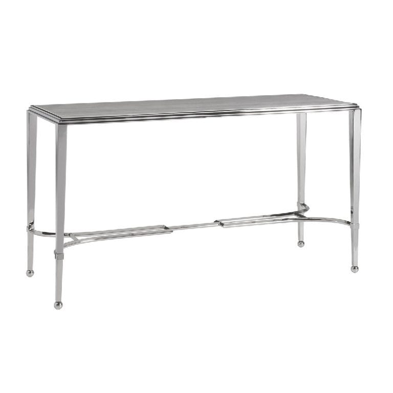 Italian silhouettes in polished stainless steel with tapered legs and an inset silver travertine top.