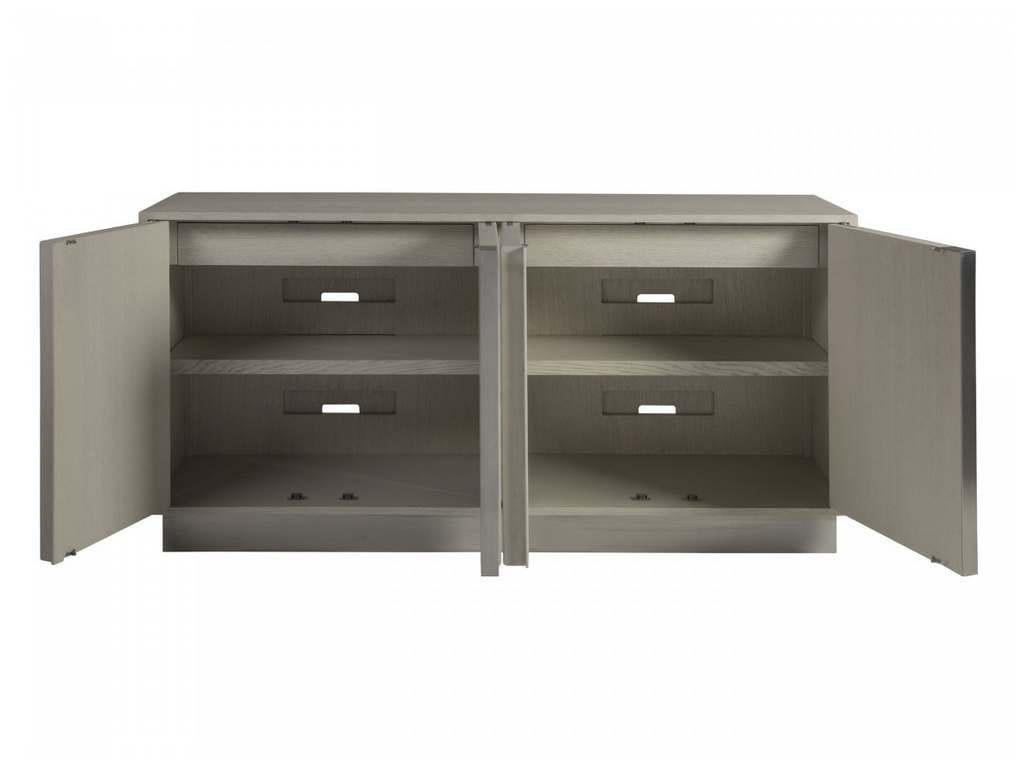 Product Description: Artistica Home 2119-907 Signature Designs Gradient Media Console Buffet - Contemporary design crafted from white oak solids and quartered oak veneers in our cerused white grey finish. Four doors feature panels in a concentric recessed pattern of small half-round moldings, two drawers, two adjustable shelves, ventilated back, inset hardware and plinth base in brushed stainless steel.