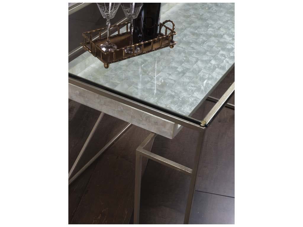 Product Description: Artistica Home 2156-933C Signature Designs Cumulus Capiz Writing Table - One of our most popular collections, we have added another finish option by pairing the champagne foil finished iron frames with capiz shell floating shelves. The writing surface for the desk is glass, creating a strikingly stunning silhouette. Shell shelf may vary from piece to piece.