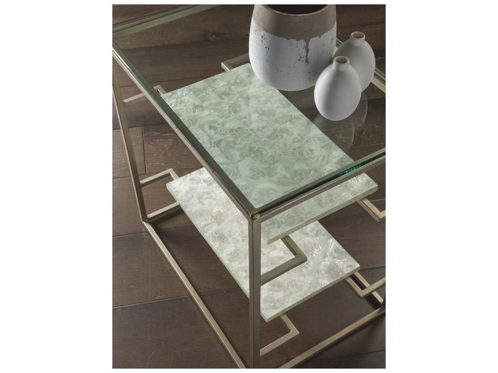 Product Description: Artistica Home 2156-955C Signature Designs Cumulus Capiz Tier Table - The scale seems to exaggerate the sleek, light beauty of the design with the capiz shell sheves glistening beneath the lay on glass top, and complimenting the champagne foil finished iron base. Shell shelves may vary from piece to piece.