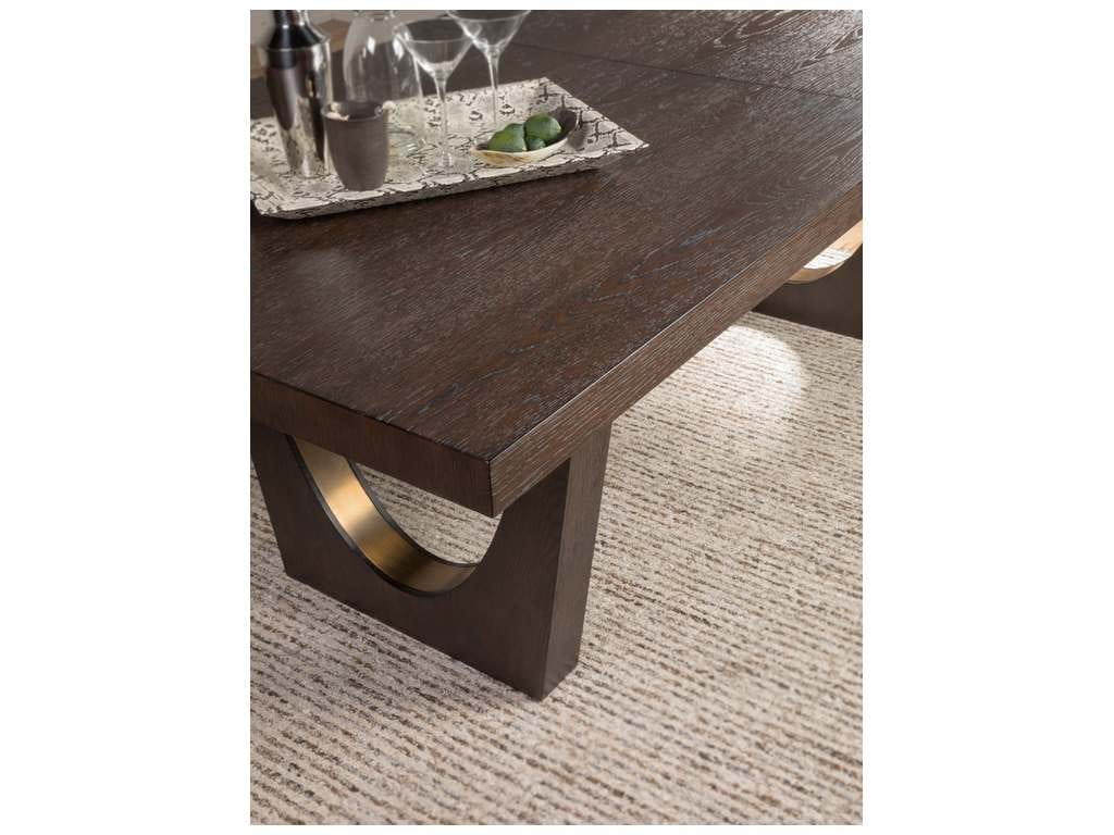 Product Description: Artistica Home 2170-877 Verbatim Verbatim Rectangular Dining Table - Striking original designs standing in wire-brushed White Oak veneers finished in rich brown with a dark glaze on the top accentuating the horizontal grain pattern. The decorative u-shaped base with inlay is finished in an antique brass. Seats 10 with the 24-inch leaf installed.