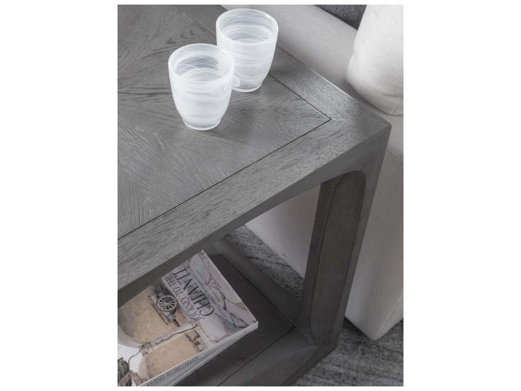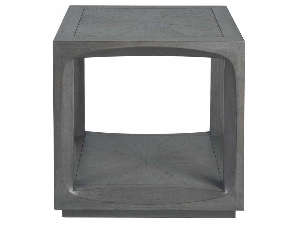 Product Description: Artistica Home 2200-957 Appellation Appellation Square End Table - The top and bottom shelf are crafted from flat-cut veneers in a starburst pattern, with legs and rails routed in a continuous ellipse, in a medium gray wire-brushed finish.