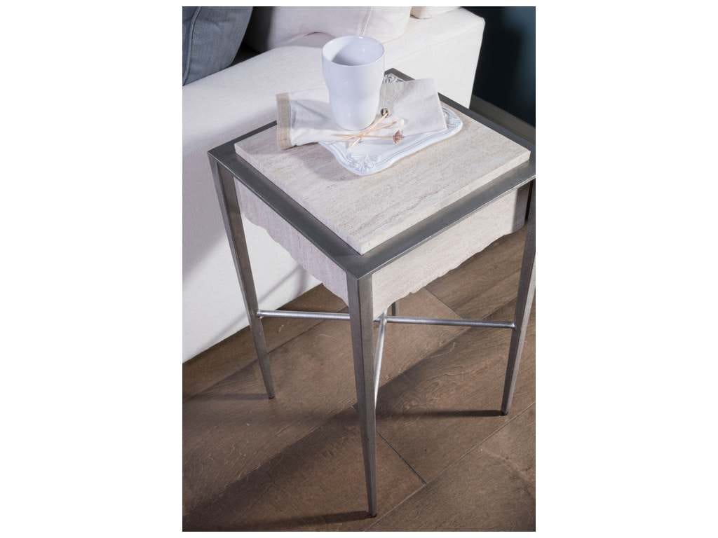 Product Description: Artistica Home 2250-950 Signature Designs Everest Square Spot Table - Contemporary designs with a white travertine top and live edge apron on the iron x-stretcher base in the silver leaf finish. Travertine is a product of nature and will vary in appearance and coloration from piece to piece.