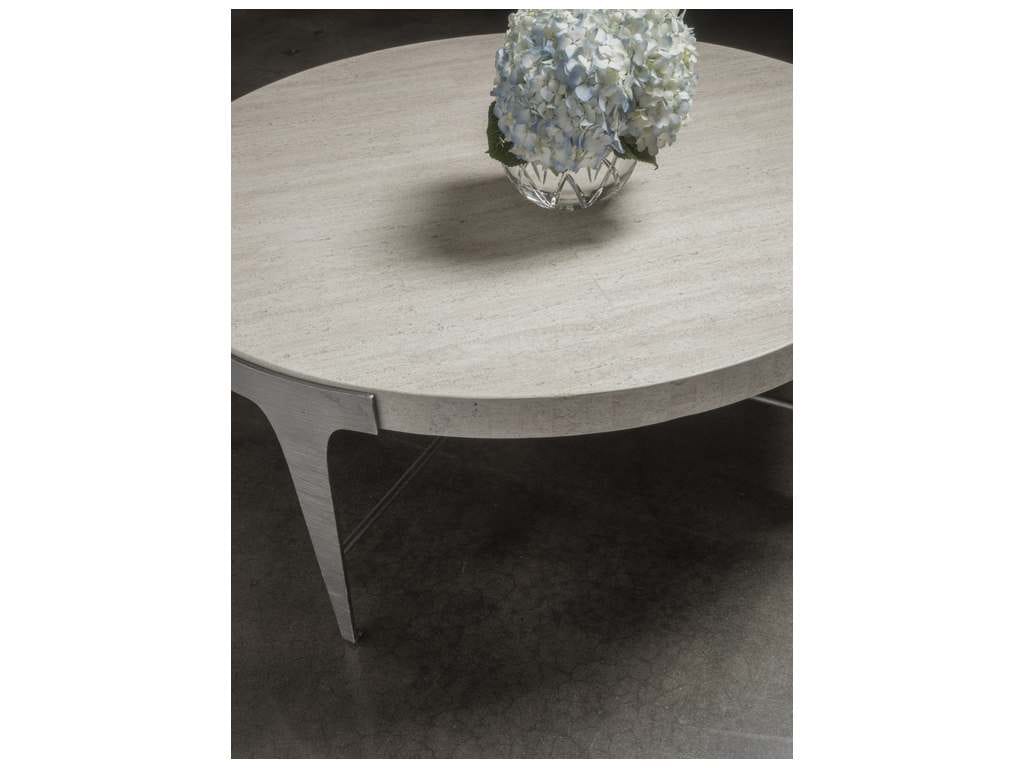 Product Description: Artistica Home 2271-947 Signature Designs Cachet Round Cocktail Table - Laser-cut steel base in a ribbed silver leaf finish with a White Vein inset travertine top resting on saber shaped legs with decorative stretcher. White Vein travertine is a product of nature and will vary in appearance and coloration from piece to piece.